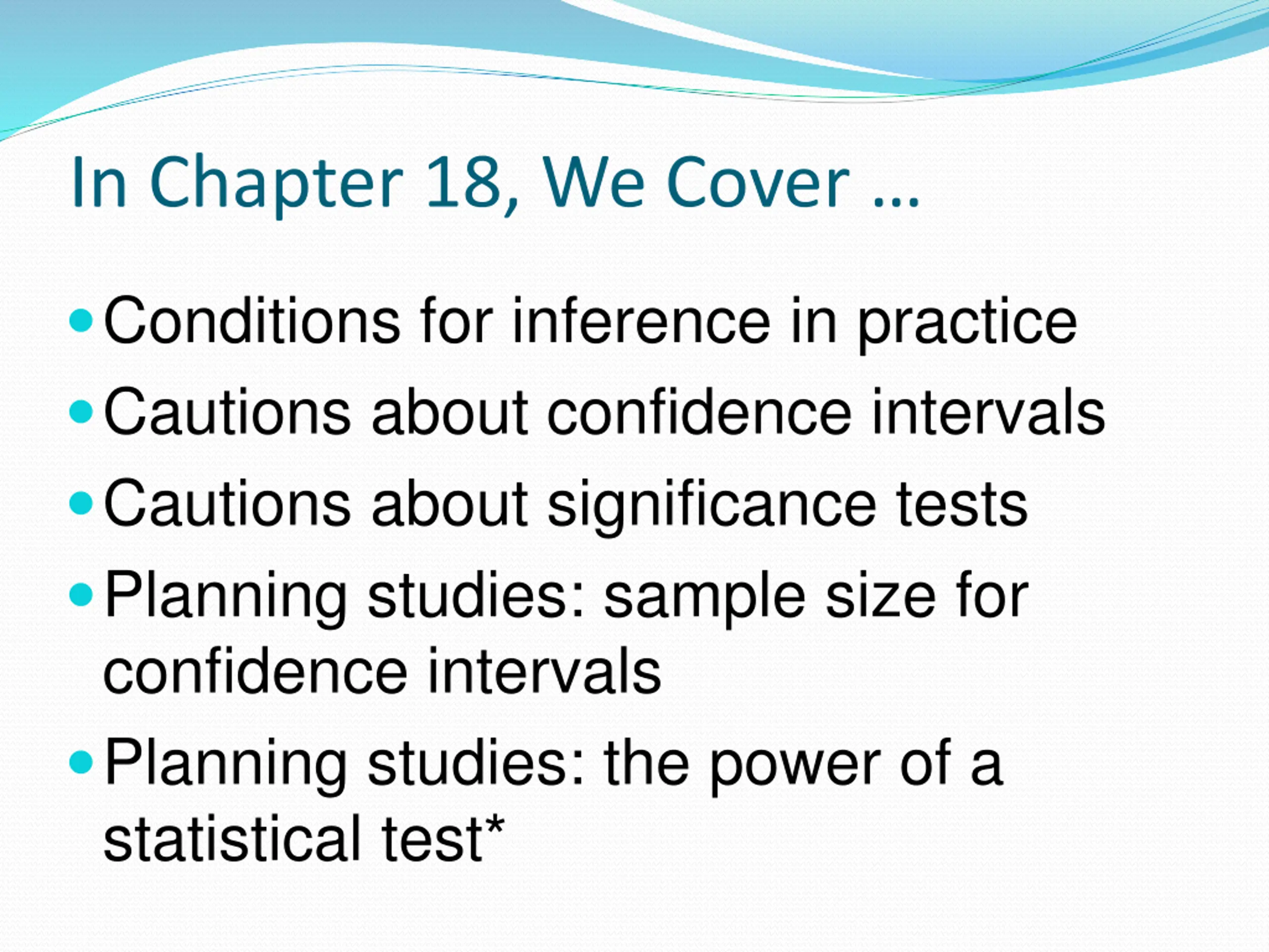 In Chapter 18, We Cover Conditions for inference in practice Cautions about confidence intervals Cautions about significance tests Planning studies: sample size for confidence intervals Planning studies: the power of a statistical test*
