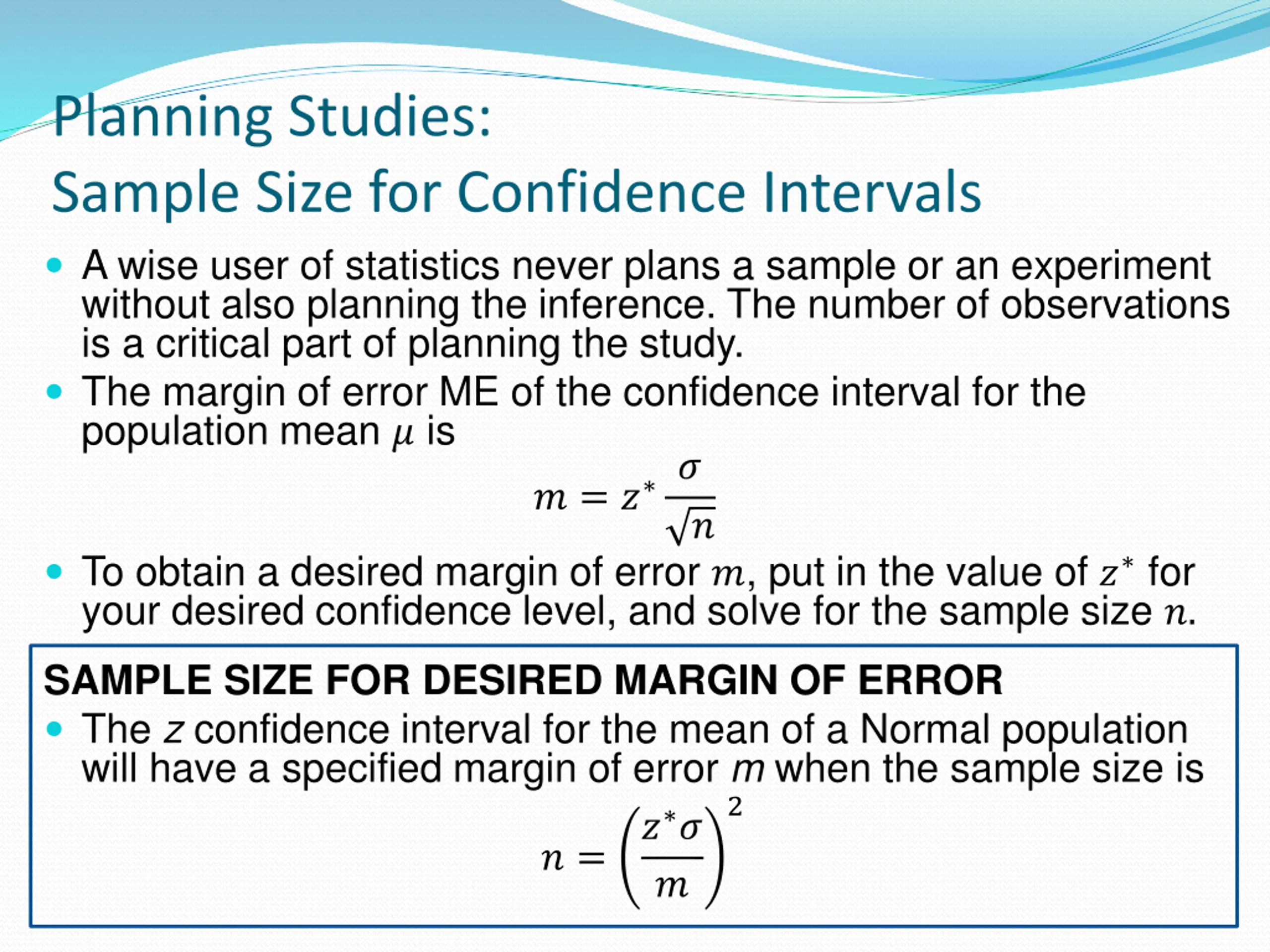 Planning Studies: Sample Size for Confidence Intervals A wise user of statistics never plans a sample or an experiment without also planning the inference. The number of observations is a critical part of planning the study. The margin of error ME of the confidence interval for the population mean ? is ? = ? ? ? To obtain a desired margin of error ?, put in the value of ? for your desired confidence level, and solve for the sample size ?. SAMPLE SIZE FOR DESIRED MARGIN OF ERROR The z confidence interval for the mean of a Normal population will have a specified margin of error m when the sample size is 2 ? ? ? ? =