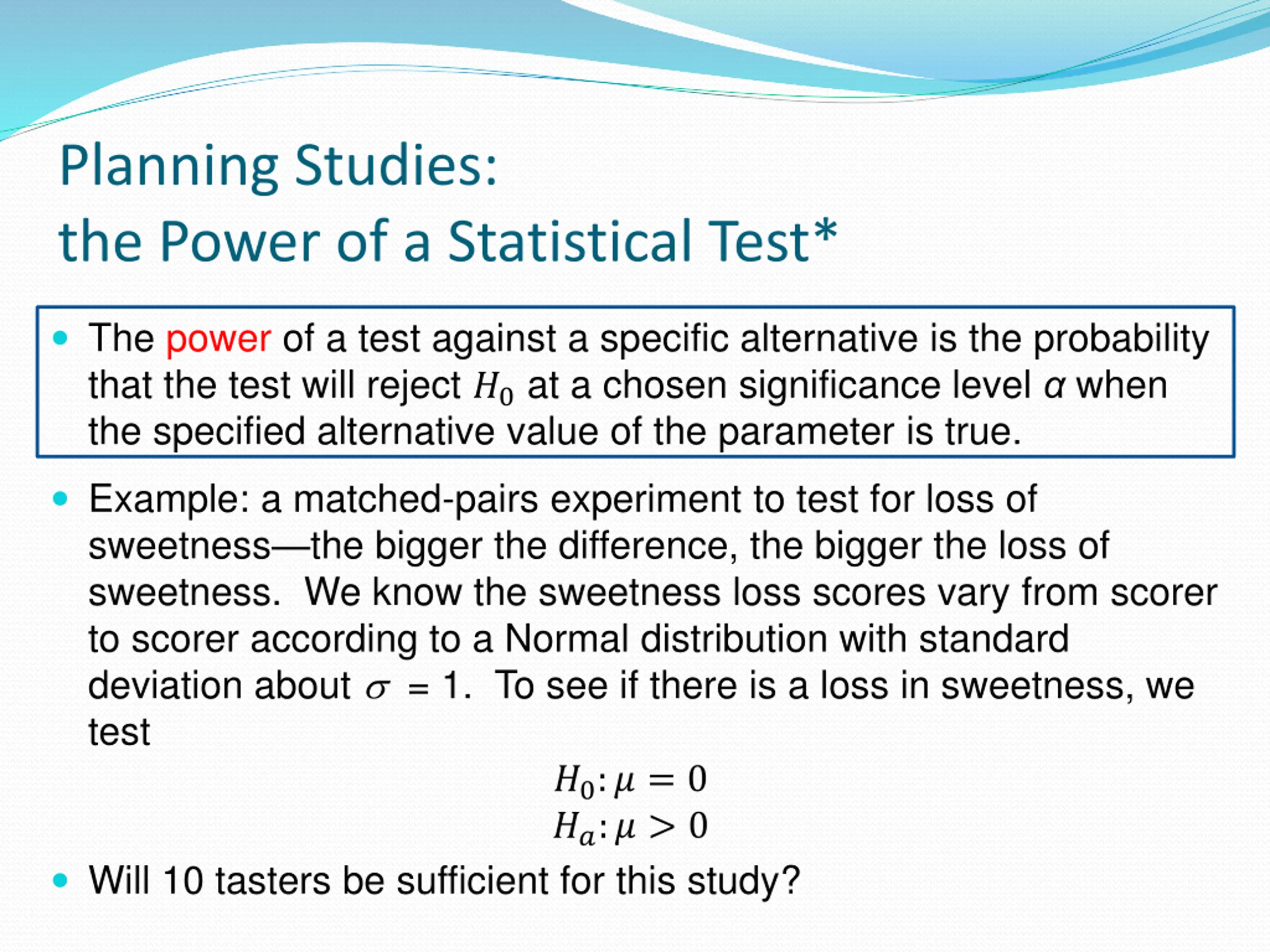 Planning Studies: the Power of a Statistical Test* The power of a test against a specific alternative is the probability that the test will reject ?0 at a chosen significance level when the specified alternative value of the parameter is true. Example: a matched-pairs experiment to test for loss of sweetness the bigger the difference, the bigger the loss of sweetness. We know the sweetness loss scores vary from scorer to scorer according to a Normal distribution with standard deviation about = 1. To see if there is a loss in sweetness, we test ?0:? = 0 ??:? > 0 Will 10 tasters be sufficient for this study?
