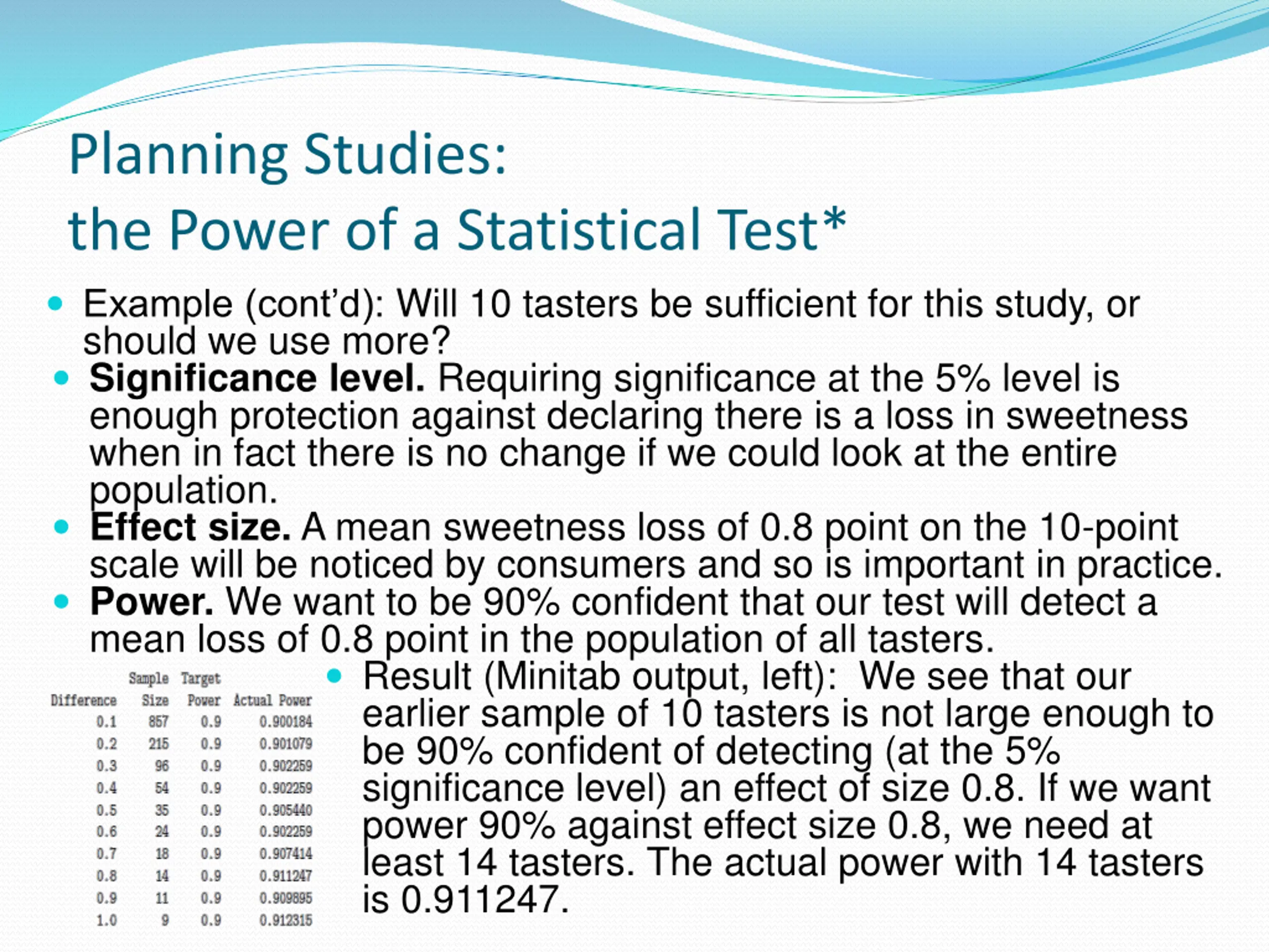 Planning Studies: the Power of a Statistical Test* Example (cont d): Will 10 tasters be sufficient for this study, or should we use more? Significance level. Requiring significance at the 5% level is enough protection against declaring there is a loss in sweetness when in fact there is no change if we could look at the entire population. Effect size. A mean sweetness loss of 0.8 point on the 10-point scale will be noticed by consumers and so is important in practice. Power. We want to be 90% confident that our test will detect a mean loss of 0.8 point in the population of all tasters. Result (Minitab output, left): We see that our earlier sample of 10 tasters is not large enough to be 90% confident of detecting (at the 5% significance level) an effect of size 0.8. If we want power 90% against effect size 0.8, we need at least 14 tasters. The actual power with 14 tasters is 0.911247.