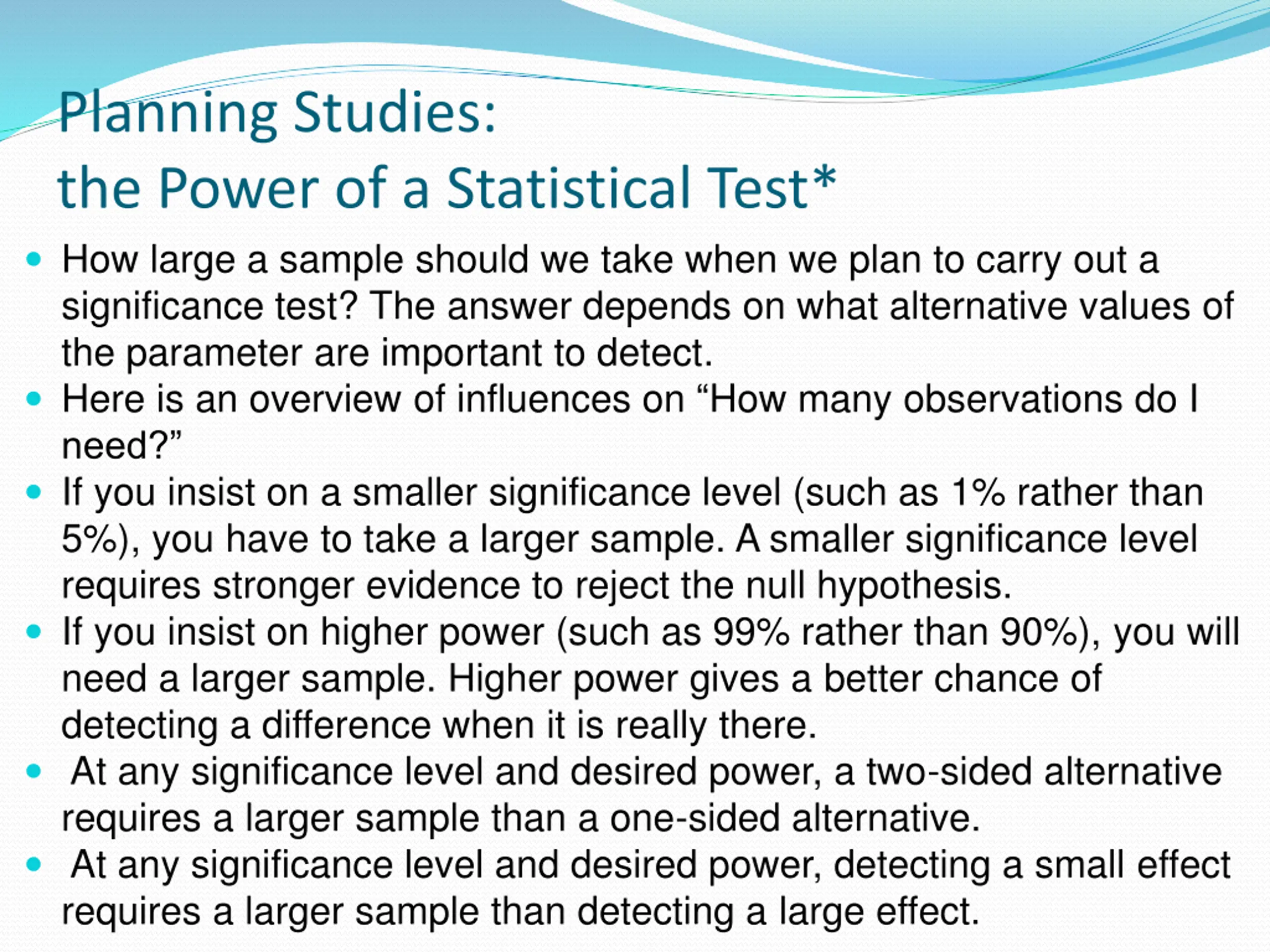 Planning Studies: the Power of a Statistical Test* How large a sample should we take when we plan to carry out a significance test? The answer depends on what alternative values of the parameter are important to detect. Here is an overview of influences on How many observations do I need? If you insist on a smaller significance level (such as 1% rather than 5%), you have to take a larger sample. A smaller significance level requires stronger evidence to reject the null hypothesis. If you insist on higher power (such as 99% rather than 90%), you will need a larger sample. Higher power gives a better chance of detecting a difference when it is really there. At any significance level and desired power, a two-sided alternative requires a larger sample than a one-sided alternative. At any significance level and desired power, detecting a small effect requires a larger sample than detecting a large effect.