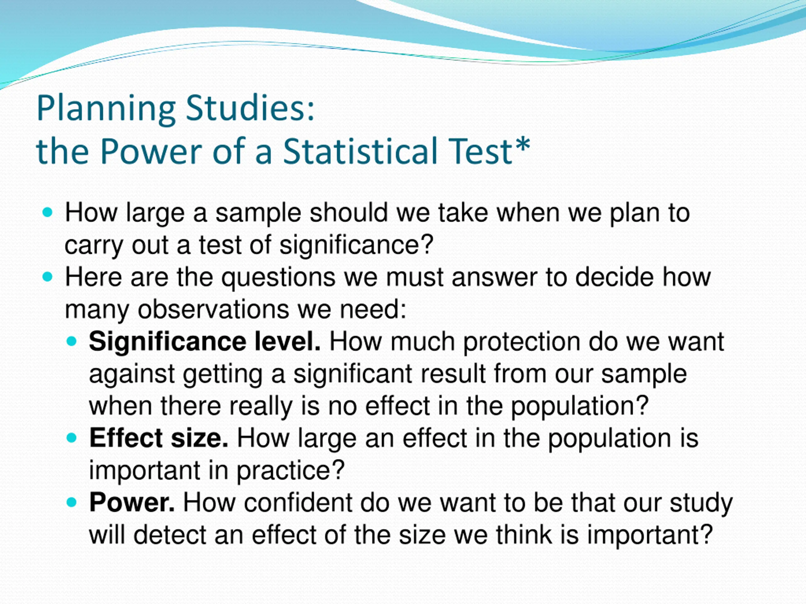 Planning Studies: the Power of a Statistical Test* How large a sample should we take when we plan to carry out a test of significance? Here are the questions we must answer to decide how many observations we need: Significance level. How much protection do we want against getting a significant result from our sample when there really is no effect in the population? Effect size. How large an effect in the population is important in practice? Power. How confident do we want to be that our study will detect an effect of the size we think is important?
