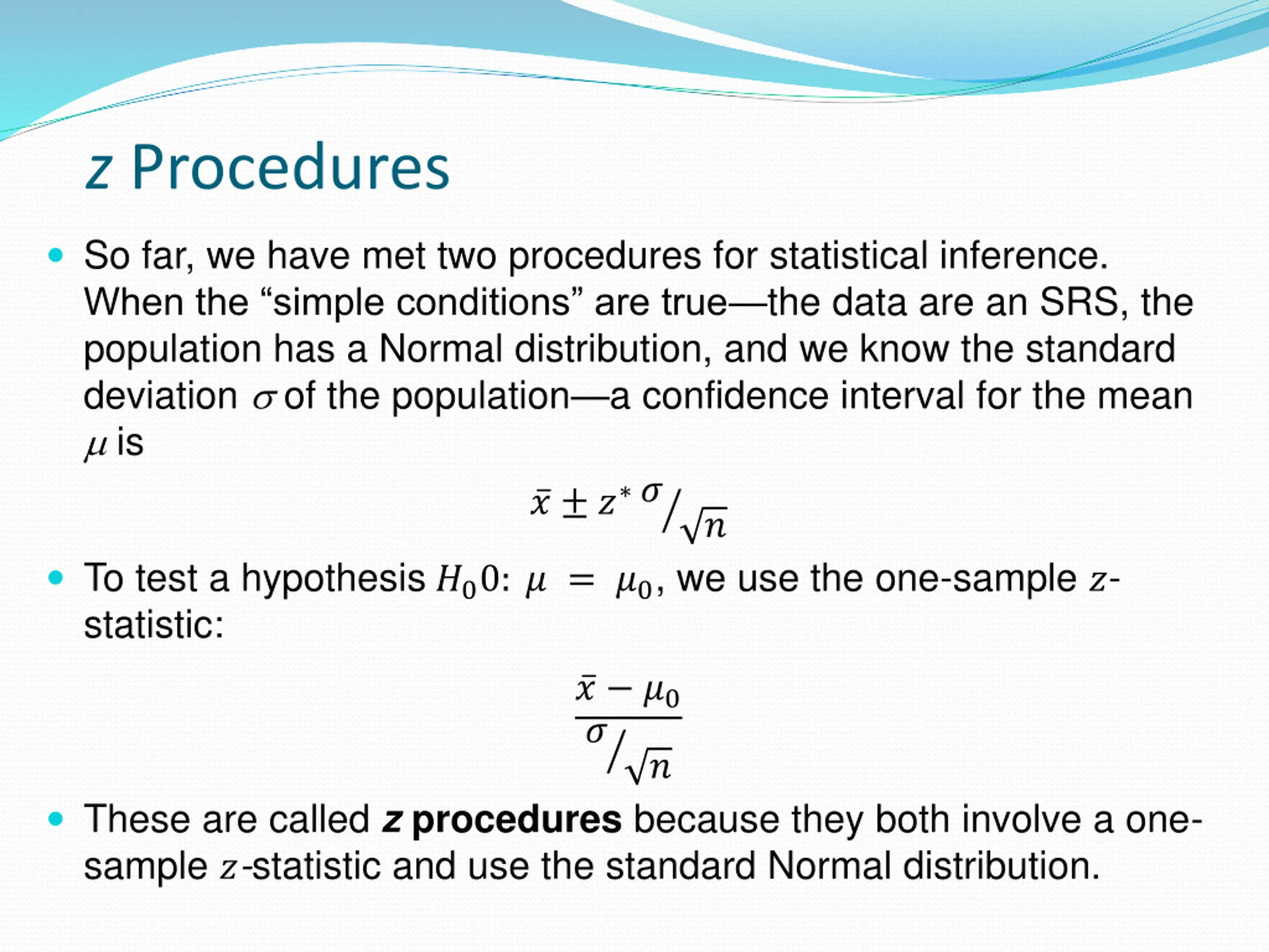 z Procedures 3 So far, we have met two procedures for statistical inference. When the simple conditions are true the data are an SRS, the population has a Normal distribution, and we know the standard deviation of the population a confidence interval for the mean is ? ? ? ? To test a hypothesis?00: ? = ?0, we use the one-sample ?- statistic: ? ?0 ? ? These are called z procedures because they both involve a one- sample ?-statistic and use the standard Normal distribution.