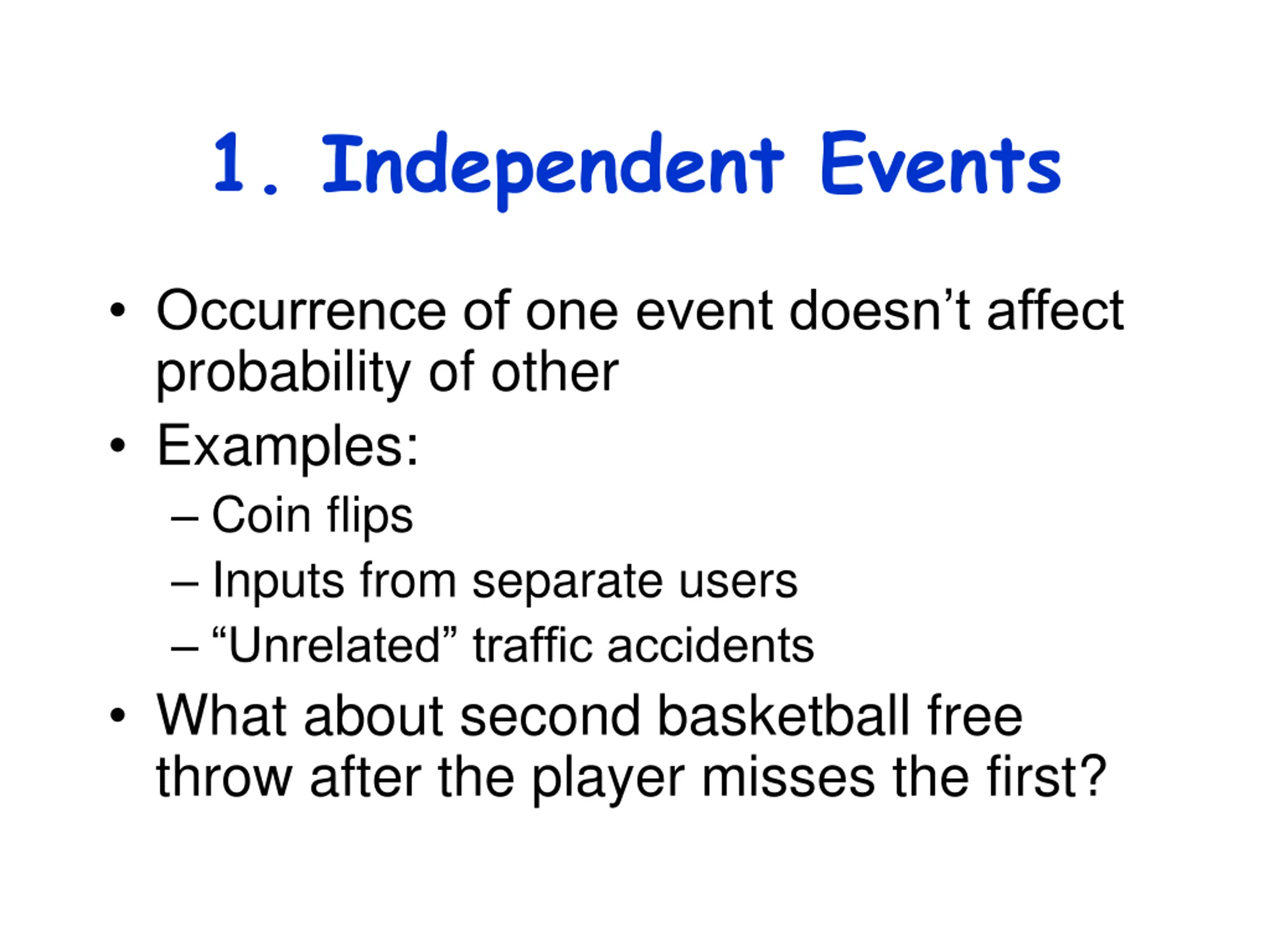 1. Independent Events Occurrence of one event doesn t affect probability of other Examples: Coin flips Inputs from separate users Unrelated traffic accidents What about second basketball free throw after the player misses the first?