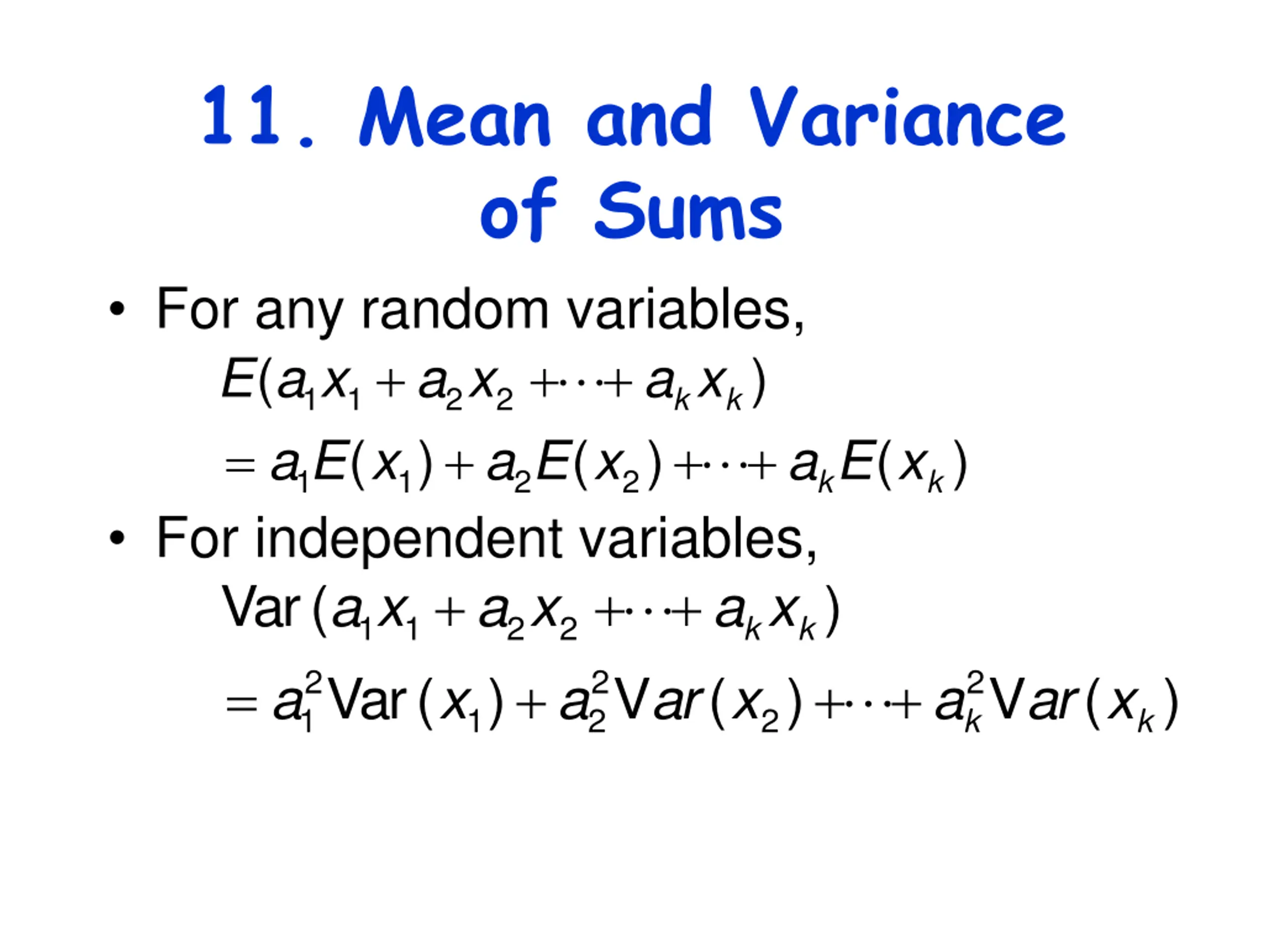 11. Mean and Variance of Sums For any random variables, ( 2 2 1 1 E a x E a + = + + + E a x a x a x ) + k + k ( ) ( x ) a E ( x ) 1 1 2 2 k k For independent variables, ( Var 1 1 x a = + + + a x a x a x ) 2 + 2 a k k + + 2 1 2 2 2 k Var ( ) V ar ( x ) a V ar ( x ) 1 2 k