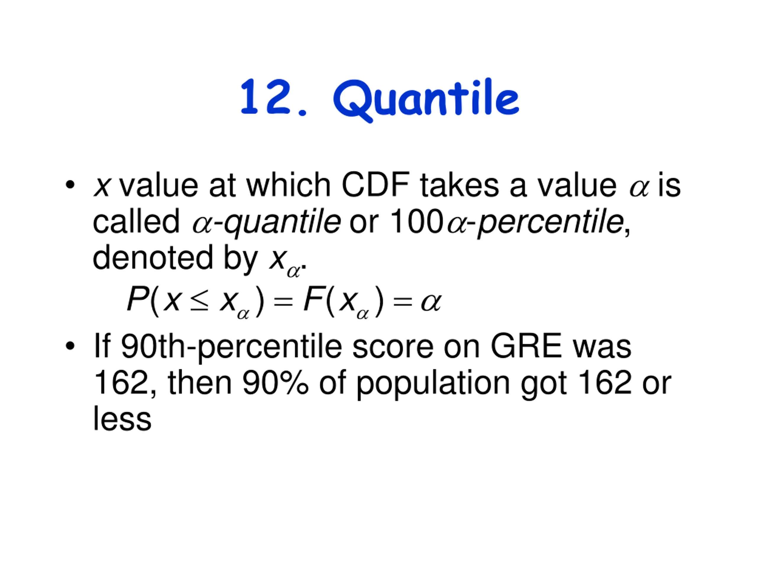 12. Quantile x value at which CDF takes a value is called -quantile or 100 -percentile, denoted by x . = ) ( ) ( x F x x P = If 90th-percentile score on GRE was 162, then 90% of population got 162 or less