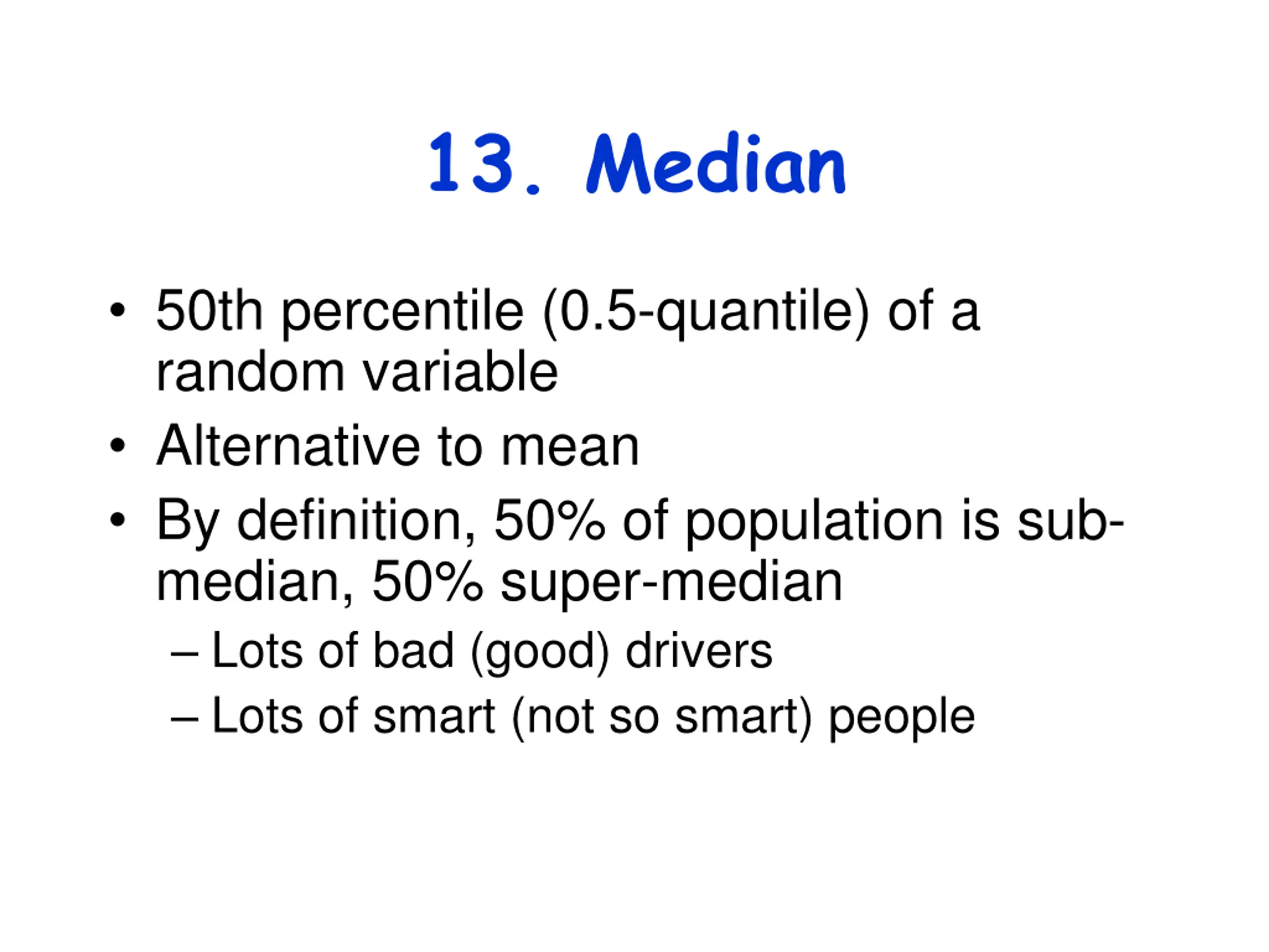13. Median 50th percentile (0.5-quantile) of a random variable Alternative to mean By definition, 50% of population is sub- median, 50% super-median Lots of bad (good) drivers Lots of smart (not so smart) people