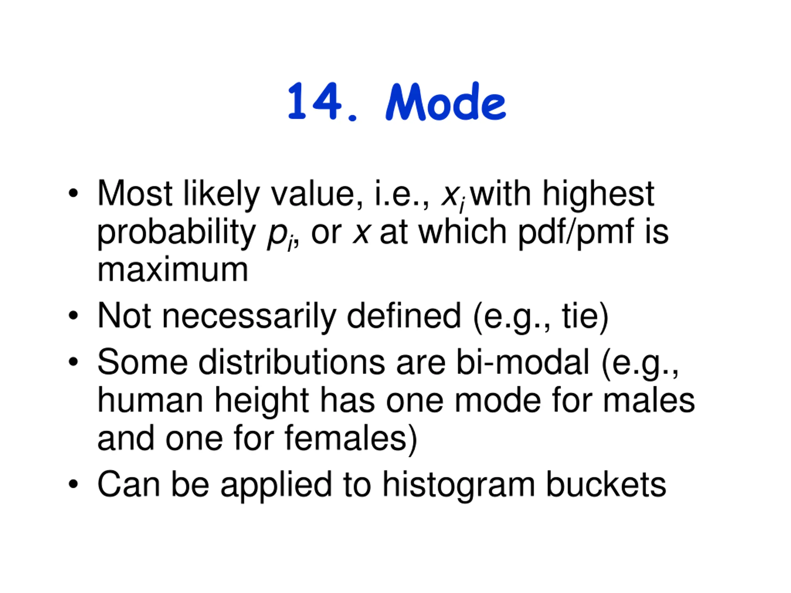 14. Mode Most likely value, i.e., xi with highest probability pi, or x at which pdf/pmf is maximum Not necessarily defined (e.g., tie) Some distributions are bi-modal (e.g., human height has one mode for males and one for females) Can be applied to histogram buckets