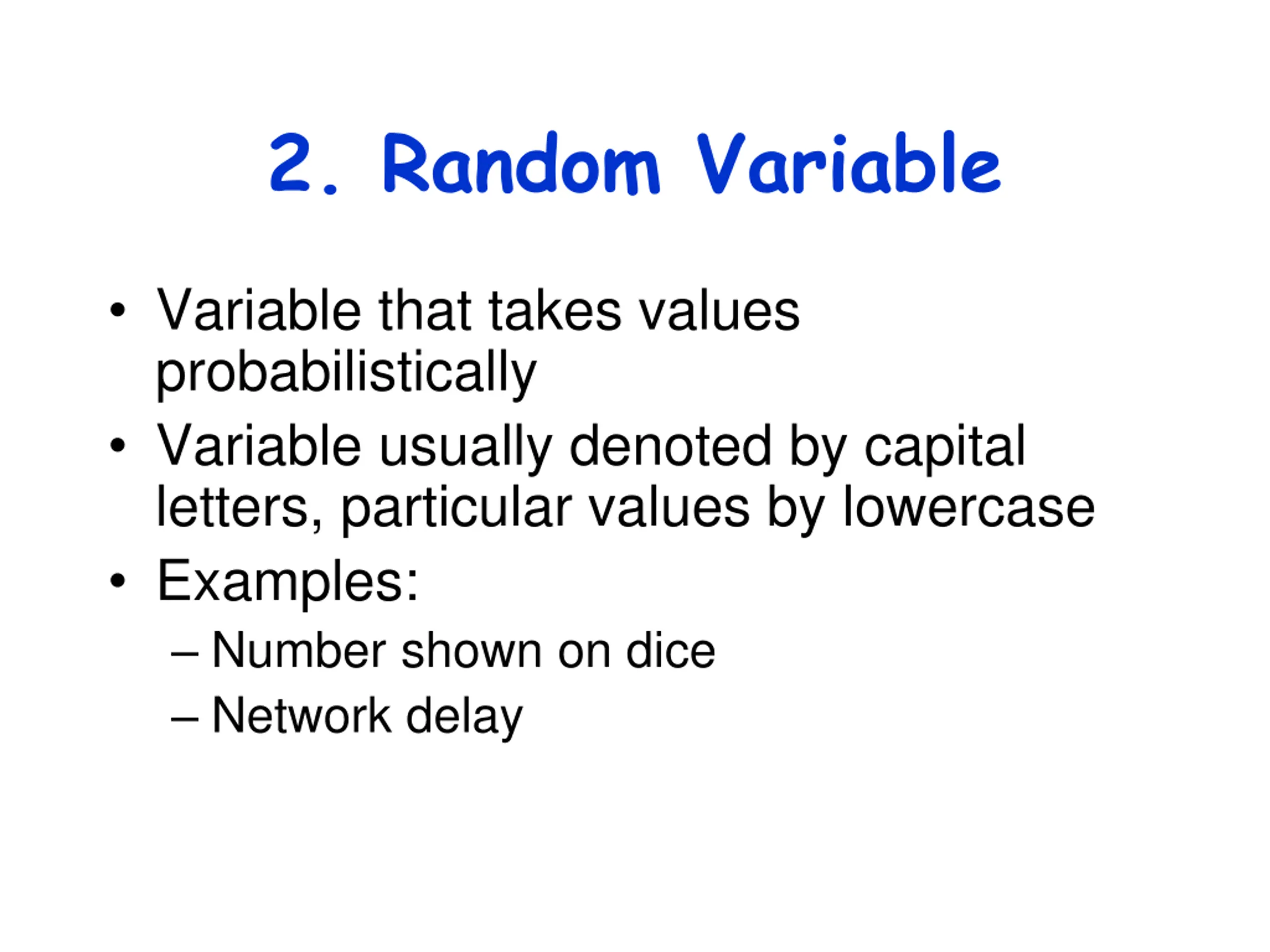 2. Random Variable Variable that takes values probabilistically Variable usually denoted by capital letters, particular values by lowercase Examples: Number shown on dice Network delay
