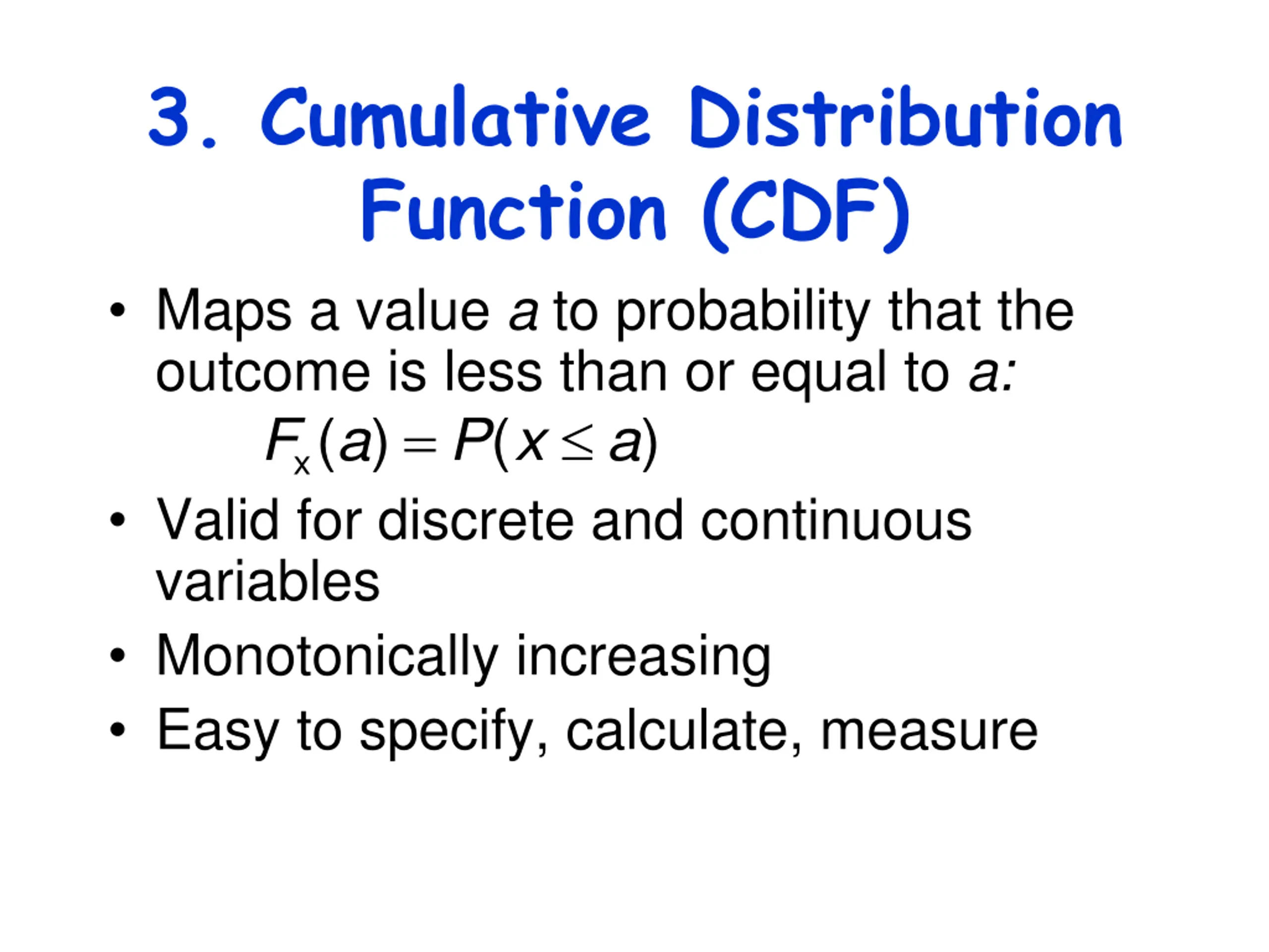 3. Cumulative Distribution Function (CDF) Maps a value a to probability that the outcome is less than or equal to a: ( ) ( x a x P a F = ) Valid for discrete and continuous variables Monotonically increasing Easy to specify, calculate, measure