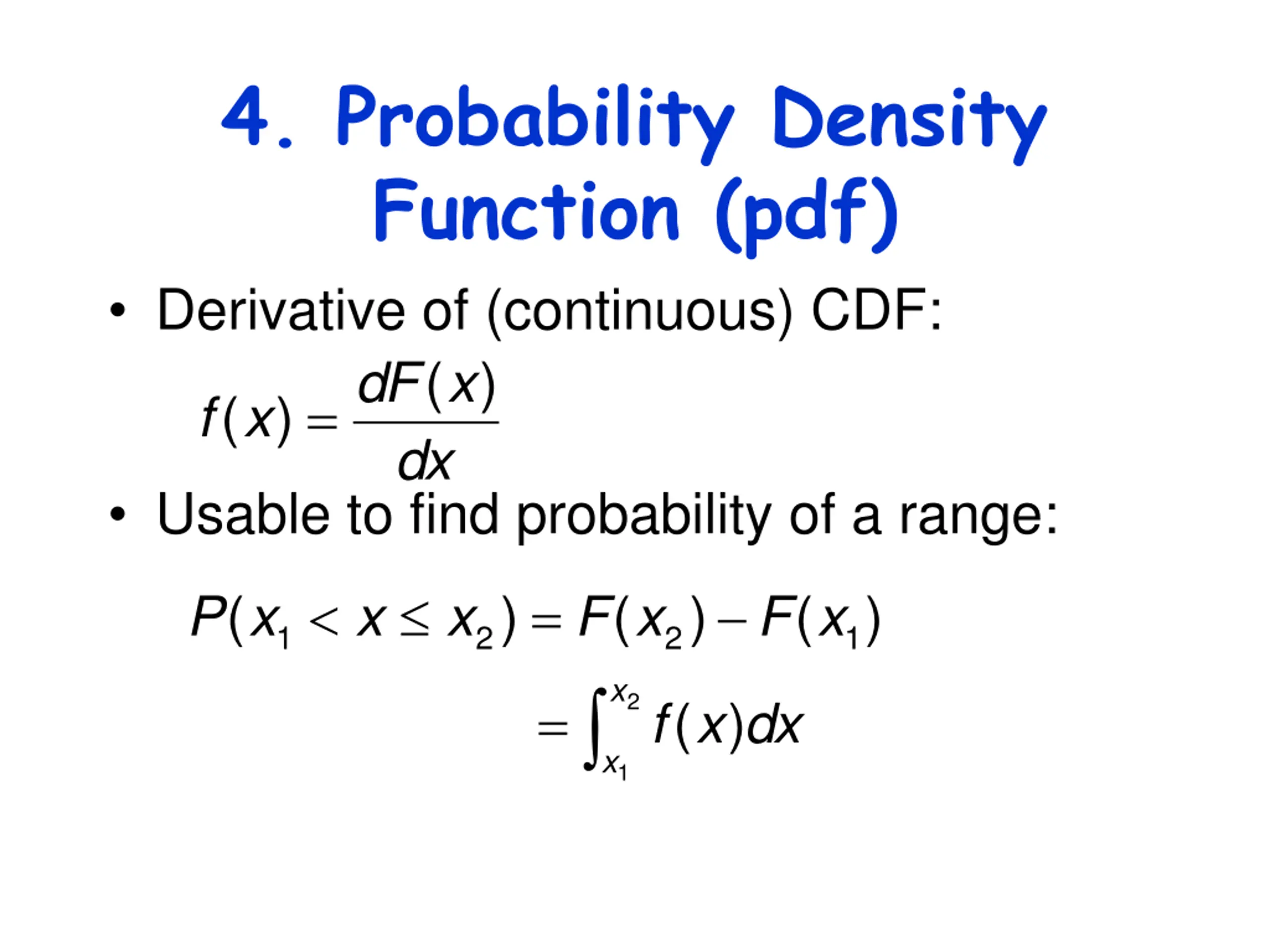 4. Probability Density Function (pdf) Derivative of (continuous) CDF: x dF x f ) ( = ( ) dx Usable to find probability of a range: = P ( x x x ) F ( x ) F ( x ) 1 2 2 1 x 2 = f ( x ) dx x 1