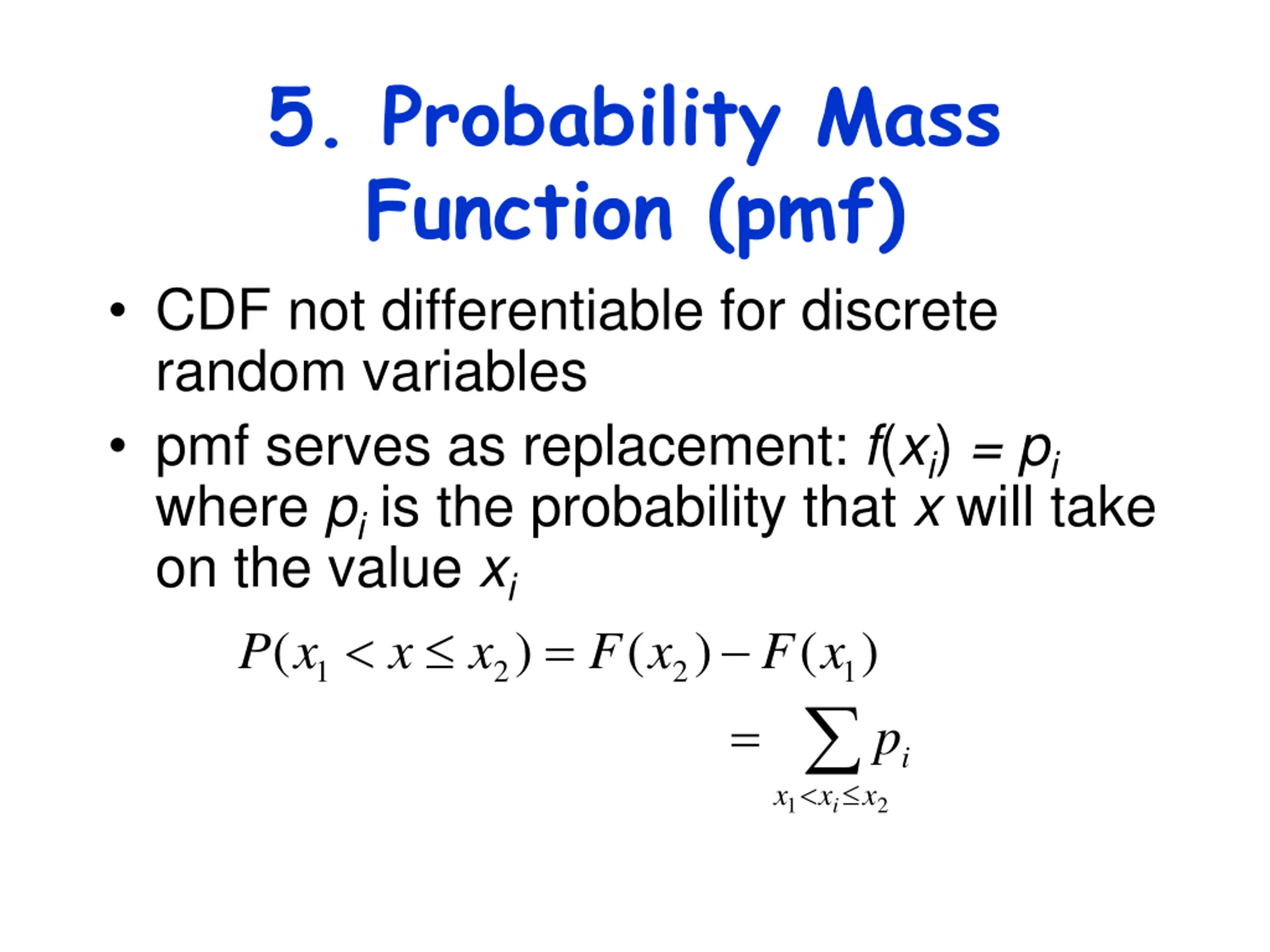 5. Probability Mass Function (pmf) CDF not differentiable for discrete random variables pmf serves as replacement: f(xi) = pi where piis the probability that x will take on the value xi = ( ) ( 2 1 F x x x P ) ( ) x F x 2 1 x = p i x x 1 2 i