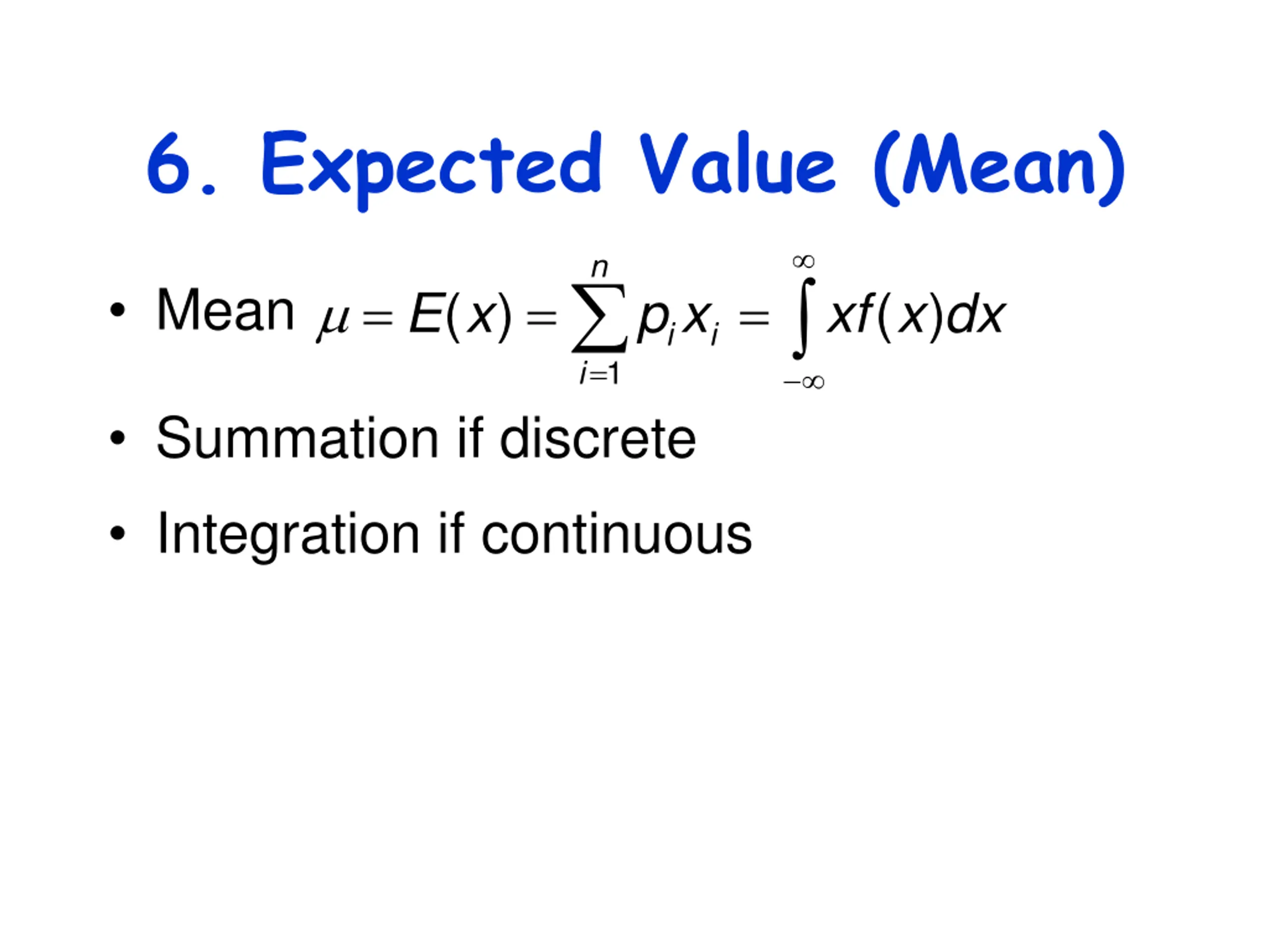 6. Expected Value (Mean) n = i Mean = = = E ( x ) p x xf ( x dx ) i i 1 Summation if discrete Integration if continuous