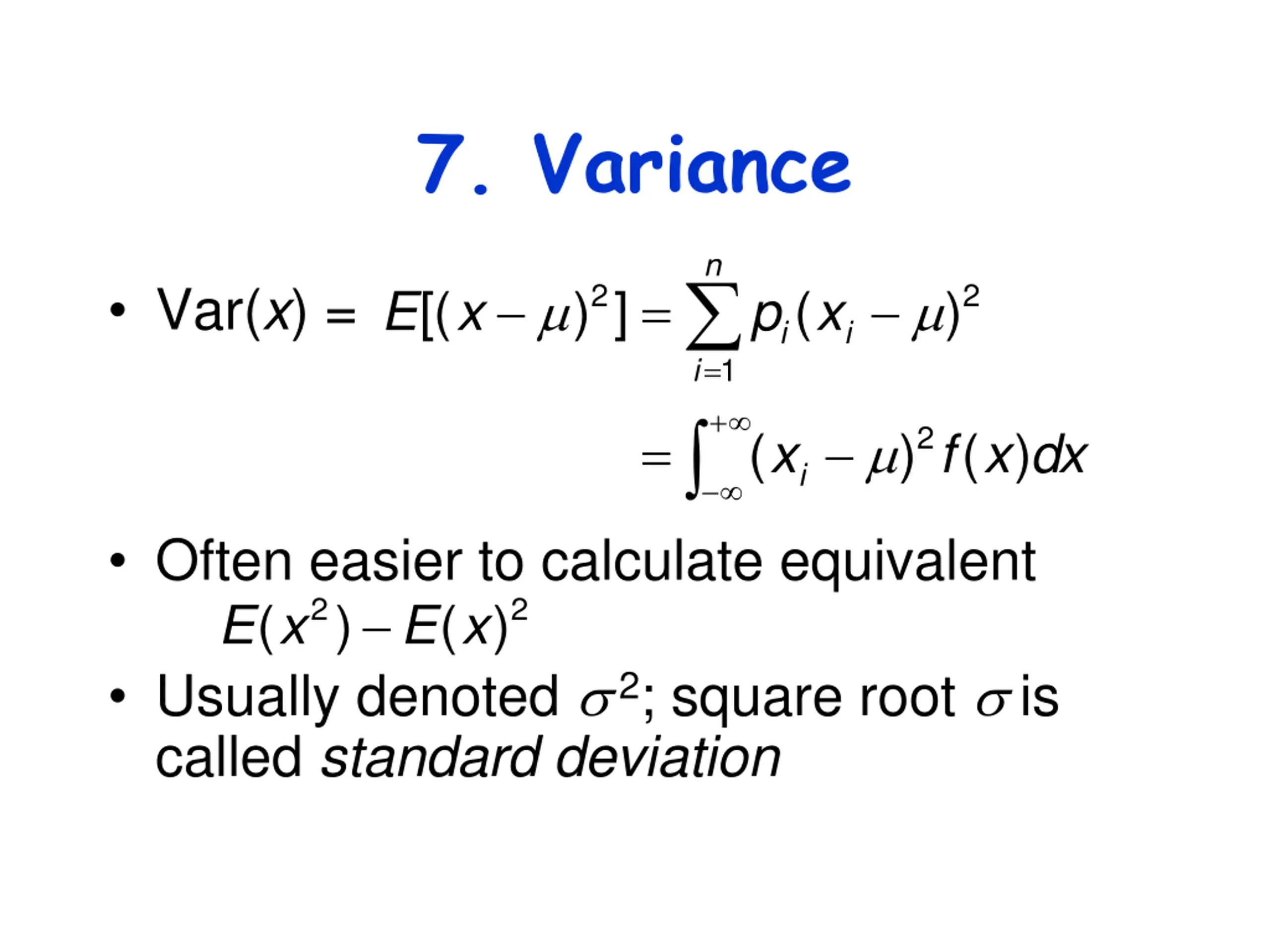 7. Variance n = i Var(x) = = 2 2 E [( x ) ] p ( x ) i i 1 + = 2 ( x ) f ( x dx ) i Often easier to calculate equivalent 2 2 ) ( ) ( x E x E Usually denoted 2; square root is called standard deviation