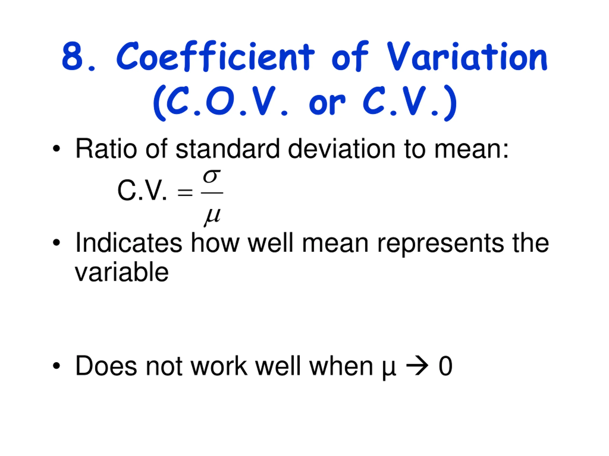 8. Coefficient of Variation (C.O.V. or C.V.) Ratio of standard deviation to mean: = C.V. Indicates how well mean represents the variable Does not work well when 0