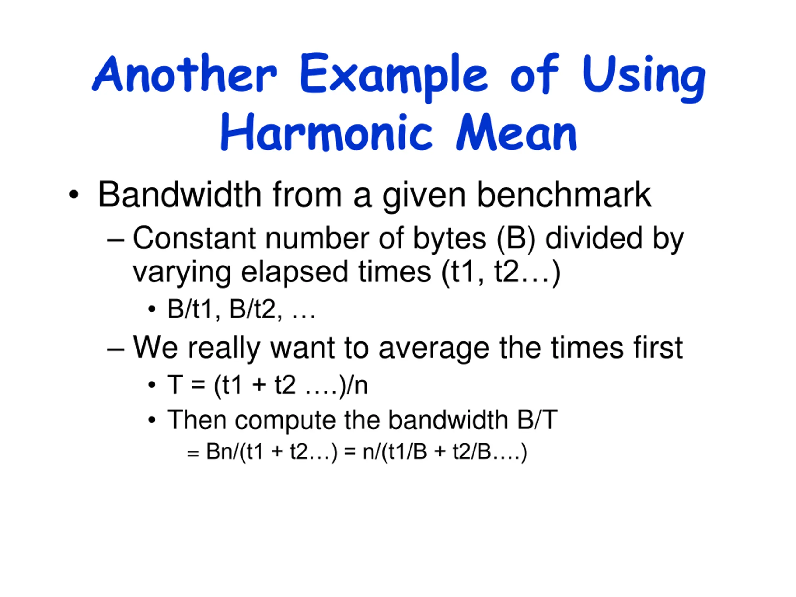 Another Example of Using Harmonic Mean Bandwidth from a given benchmark Constant number of bytes (B) divided by varying elapsed times (t1, t2 ) B/t1, B/t2, We really want to average the times first T = (t1 + t2 .)/n Then compute the bandwidth B/T = Bn/(t1 + t2 ) = n/(t1/B + t2/B .)