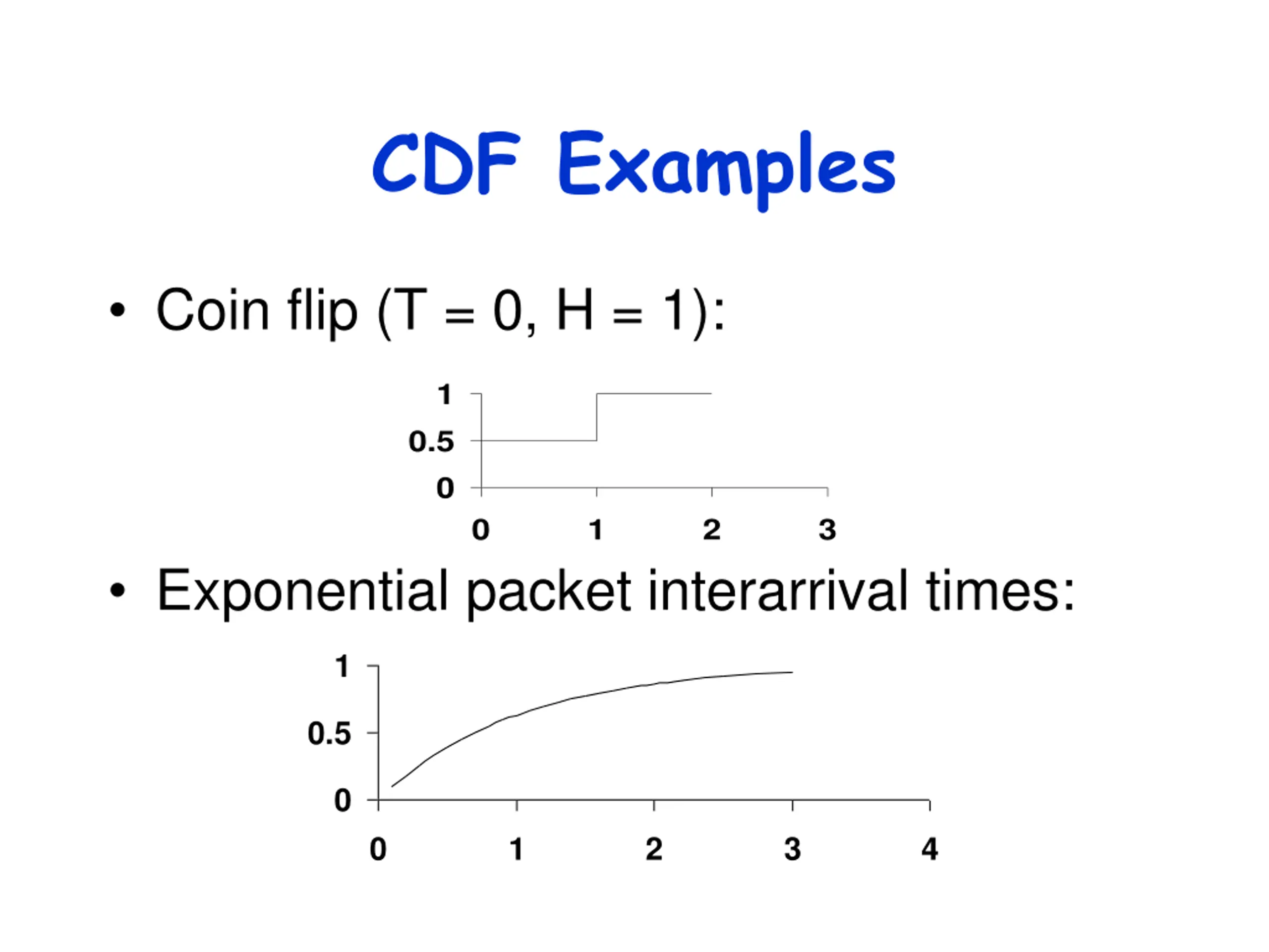 CDF Examples Coin flip (T = 0, H = 1): 1 0.5 0 0 1 2 3 Exponential packet interarrival times: 1 0.5 0 0 1 2 3 4