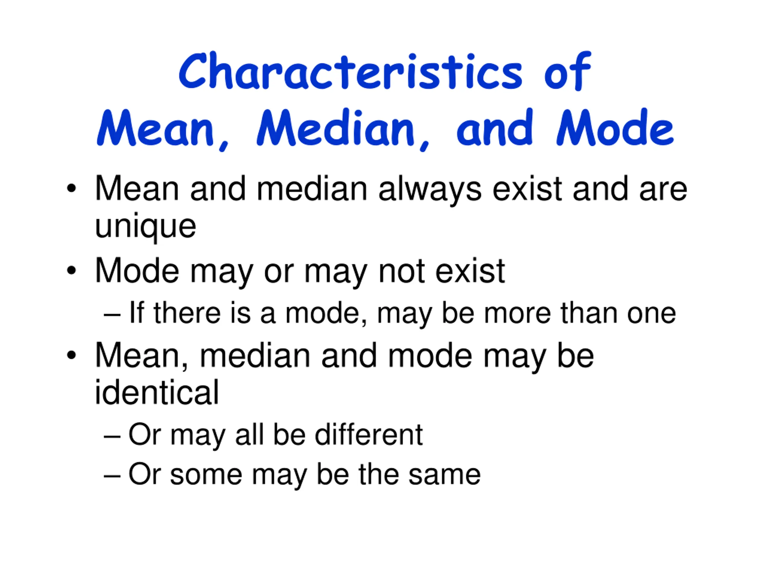 Characteristics of Mean, Median, and Mode Mean and median always exist and are unique Mode may or may not exist If there is a mode, may be more than one Mean, median and mode may be identical Or may all be different Or some may be the same