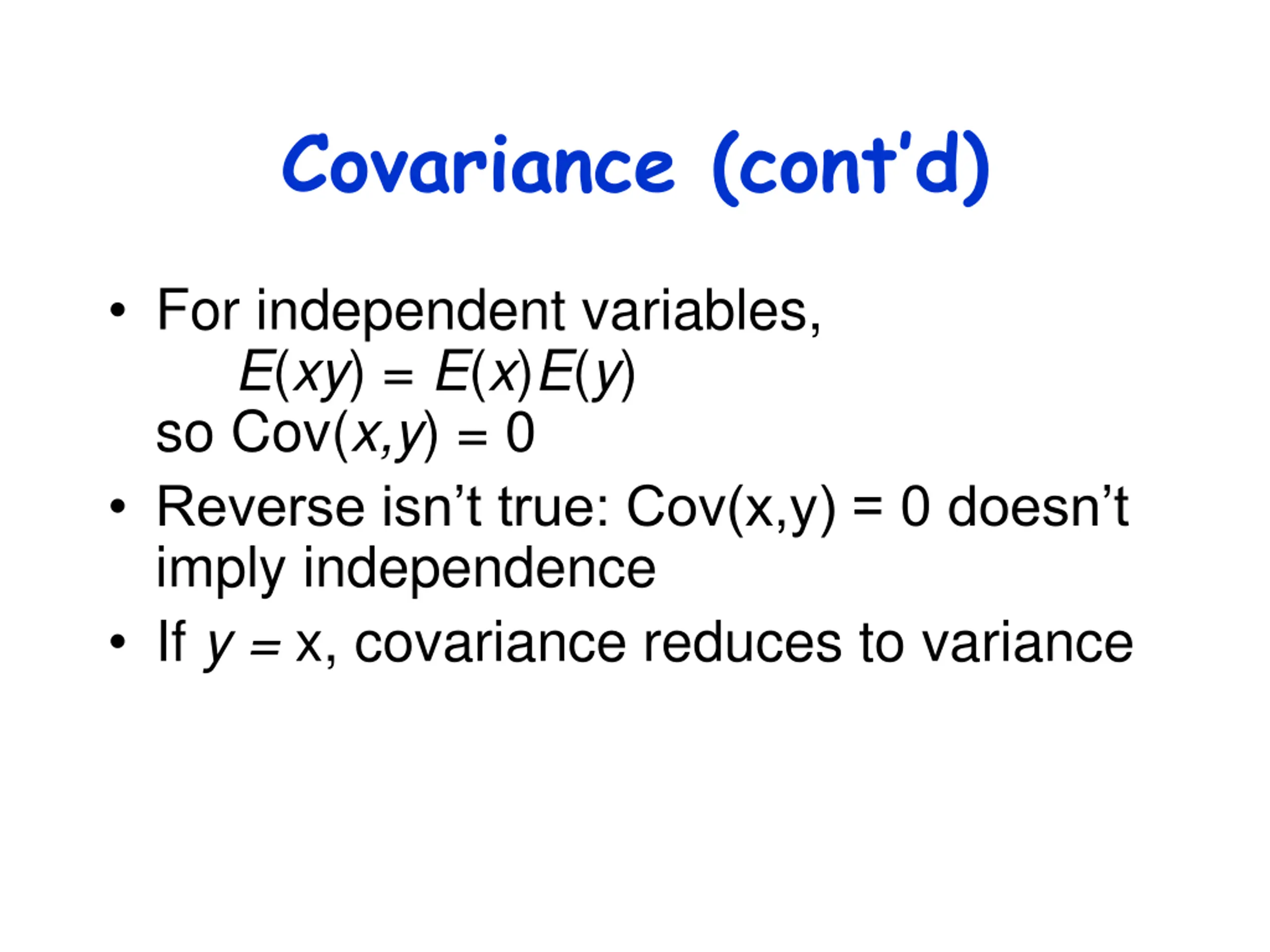 Covariance (contd) For independent variables, E(xy) = E(x)E(y) so Cov(x,y) = 0 Reverse isn t true: Cov(x,y) = 0 doesn t imply independence If y = x, covariance reduces to variance