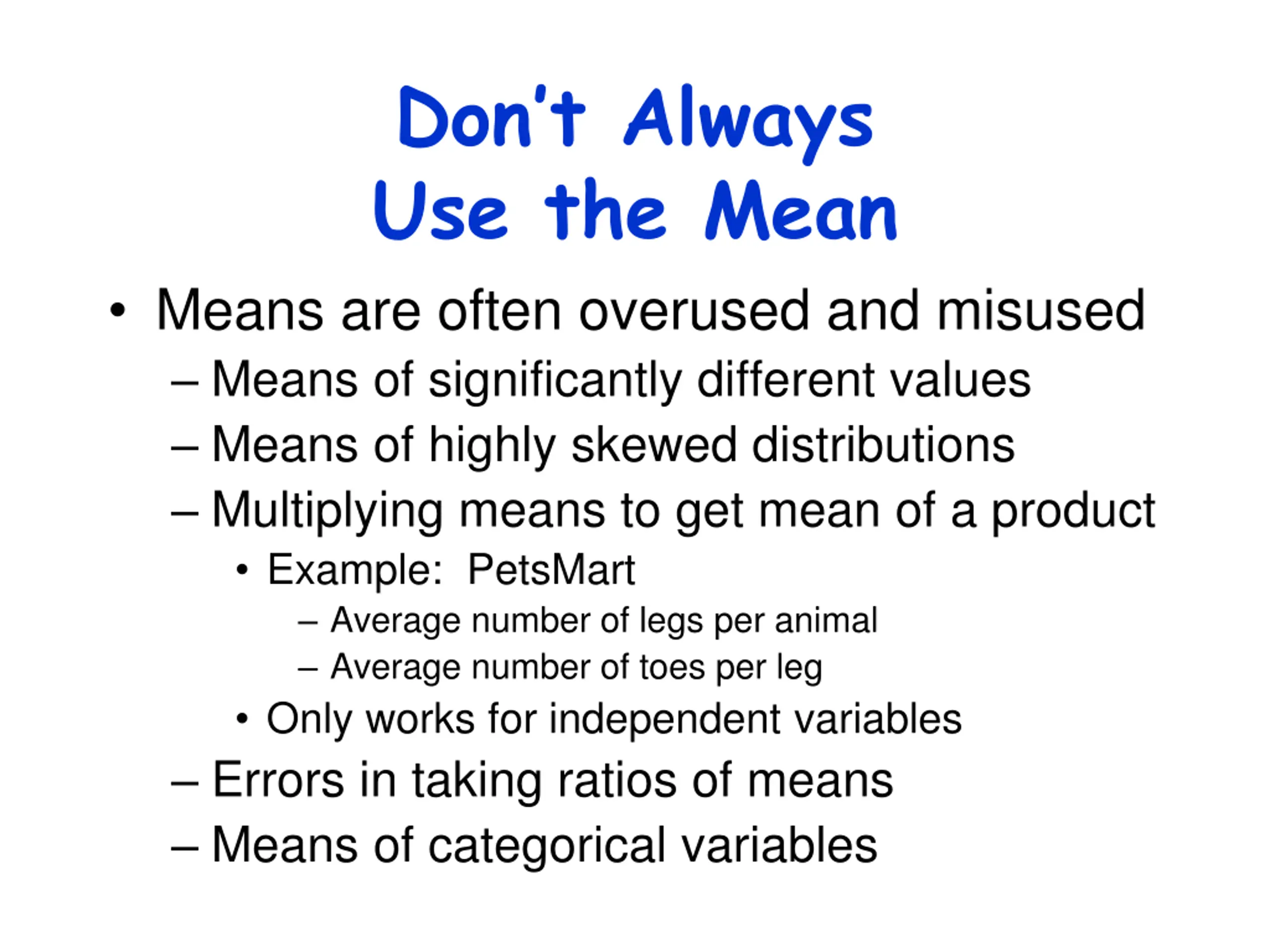 Dont Always Use the Mean Means are often overused and misused Means of significantly different values Means of highly skewed distributions Multiplying means to get mean of a product Example: PetsMart Average number of legs per animal Average number of toes per leg Only works for independent variables Errors in taking ratios of means Means of categorical variables