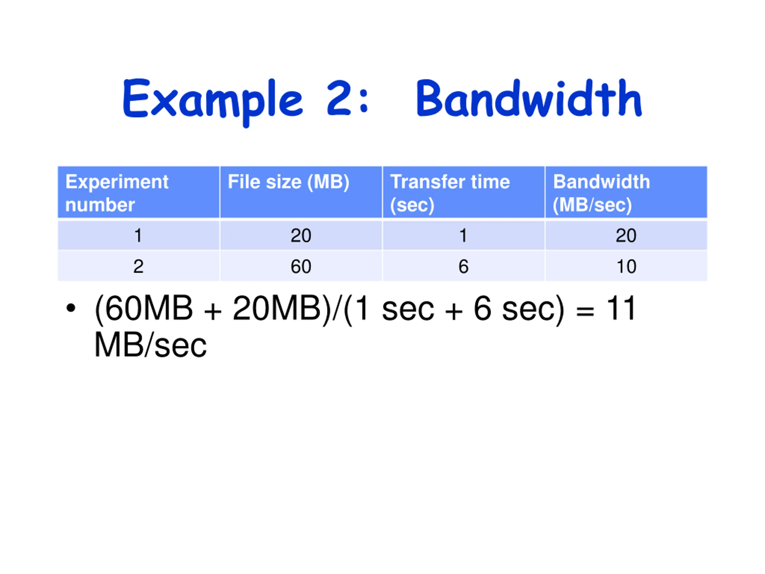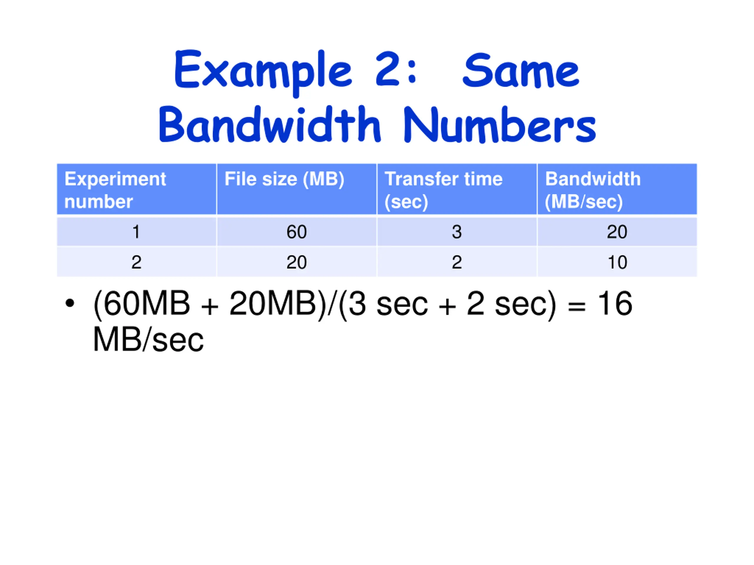 Example 2: Same Bandwidth Numbers Experiment number File size (MB) Transfer time (sec) Bandwidth (MB/sec) 1 2 60 20 3 2 20 10 (60MB + 20MB)/(3 sec + 2 sec) = 16 MB/sec