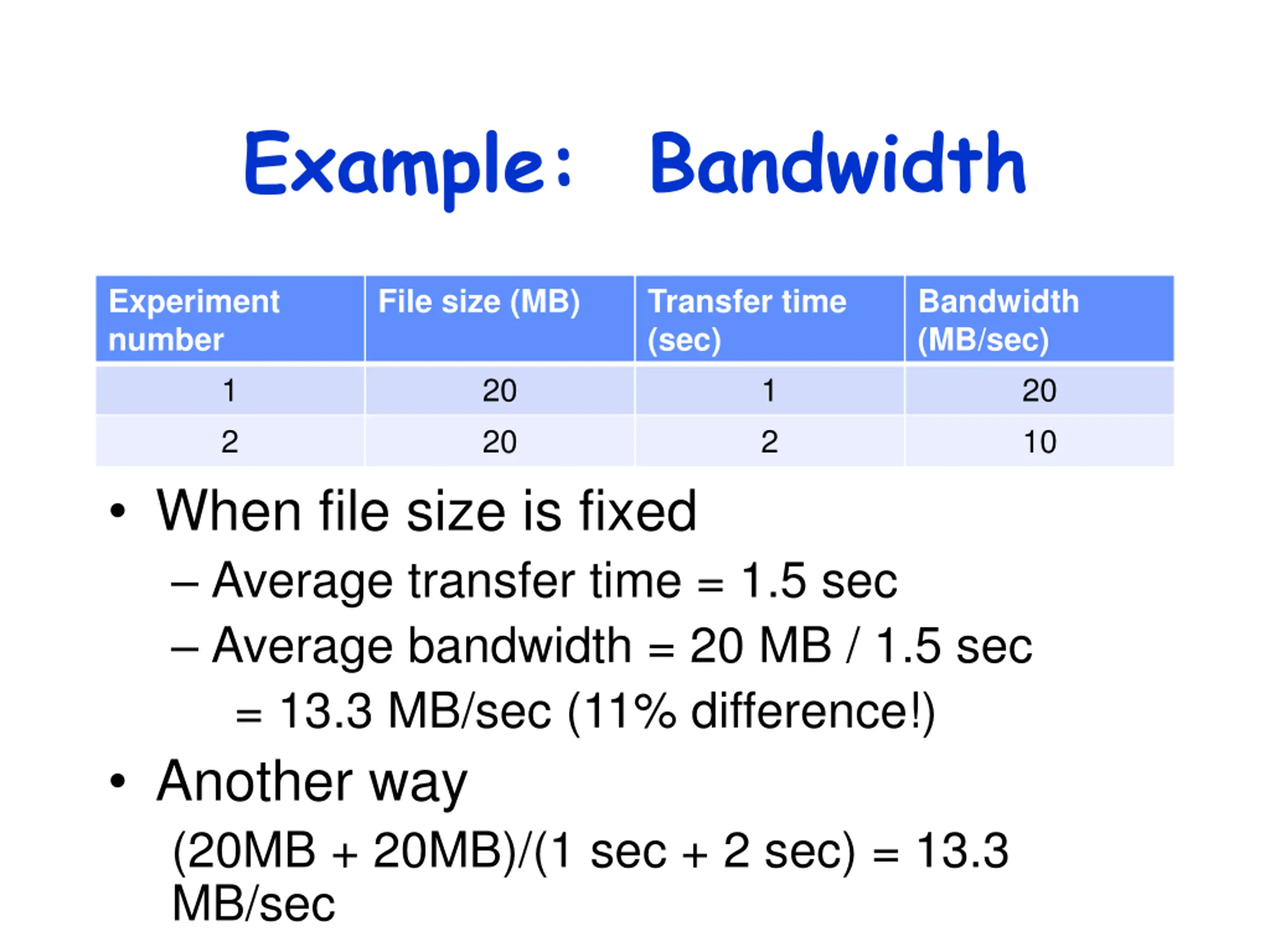Example: Bandwidth Experiment number File size (MB) Transfer time (sec) Bandwidth (MB/sec) 1 2 20 20 1 2 20 10 When file size is fixed Average transfer time = 1.5 sec Average bandwidth = 20 MB / 1.5 sec = 13.3 MB/sec (11% difference!) Another way (20MB + 20MB)/(1 sec + 2 sec) = 13.3 MB/sec