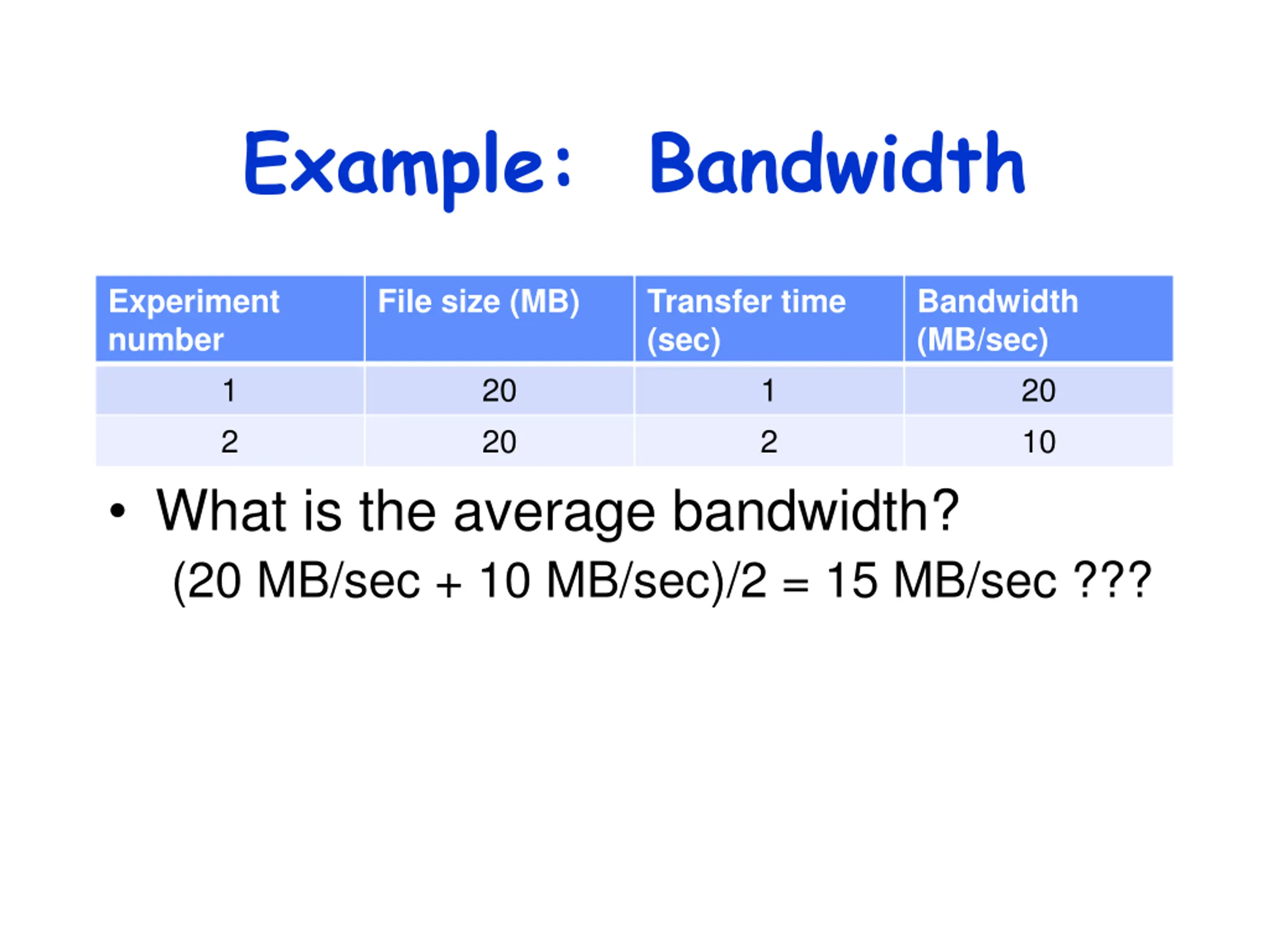Example: Bandwidth Experiment number File size (MB) Transfer time (sec) Bandwidth (MB/sec) 1 2 20 20 1 2 20 10 What is the average bandwidth? (20 MB/sec + 10 MB/sec)/2 = 15 MB/sec ???