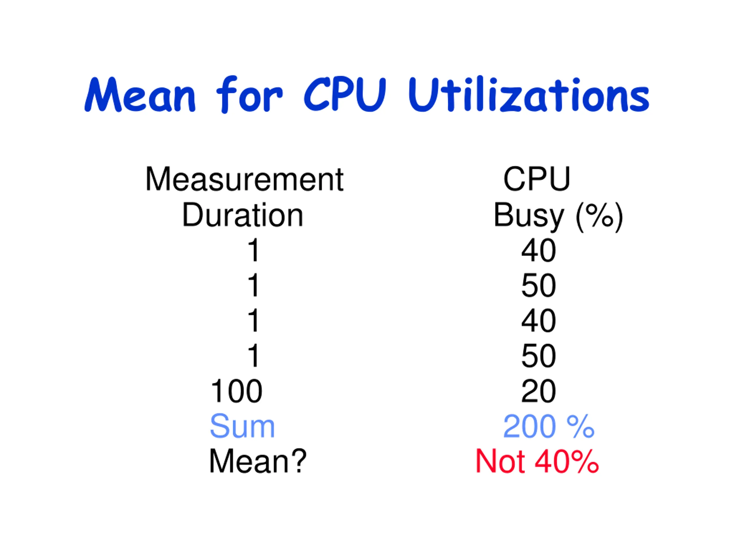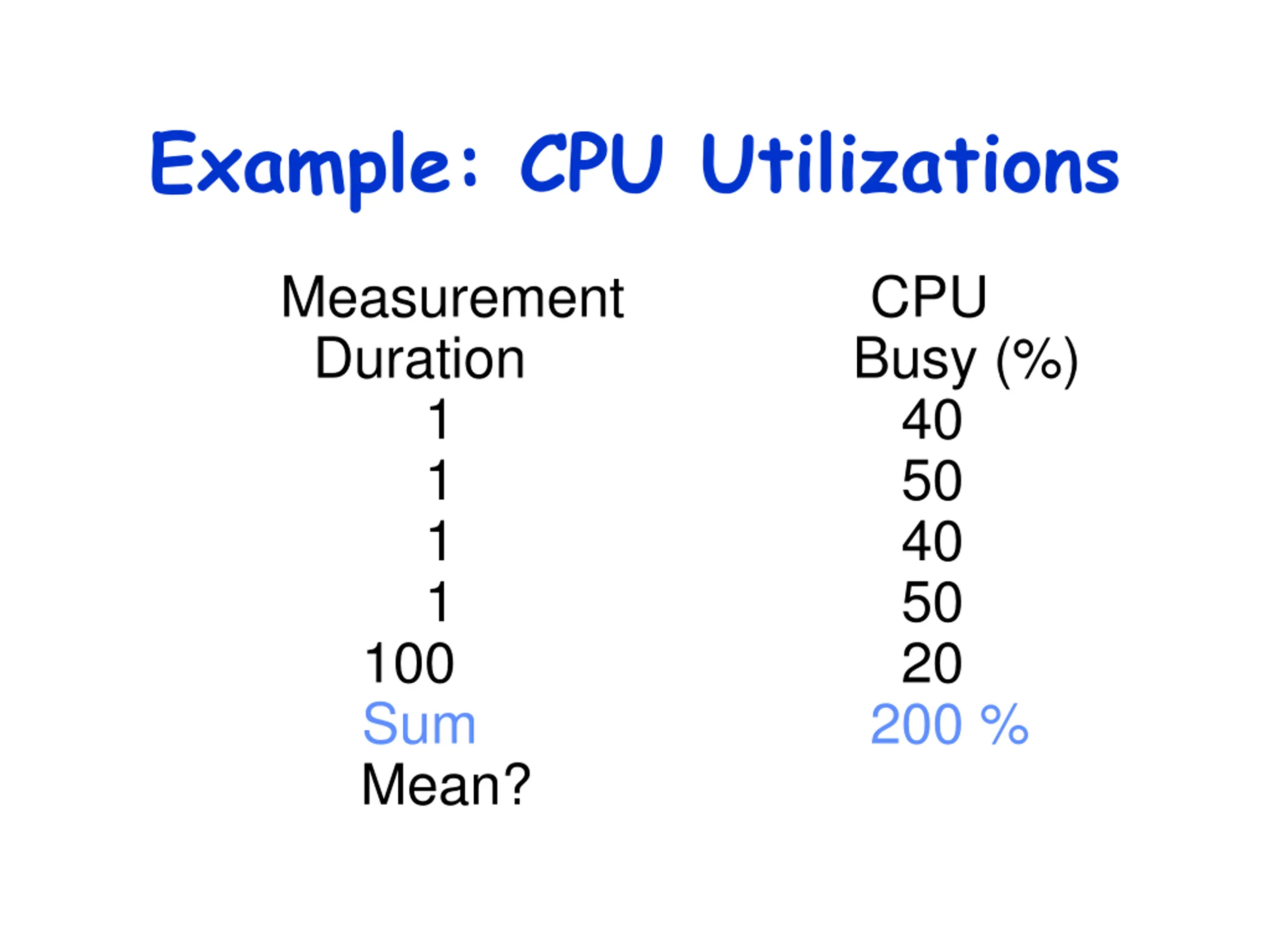 Example: CPU Utilizations Measurement Duration 1 1 1 1 100 Sum Mean? Busy (%) 40 50 40 50 20 200 % CPU