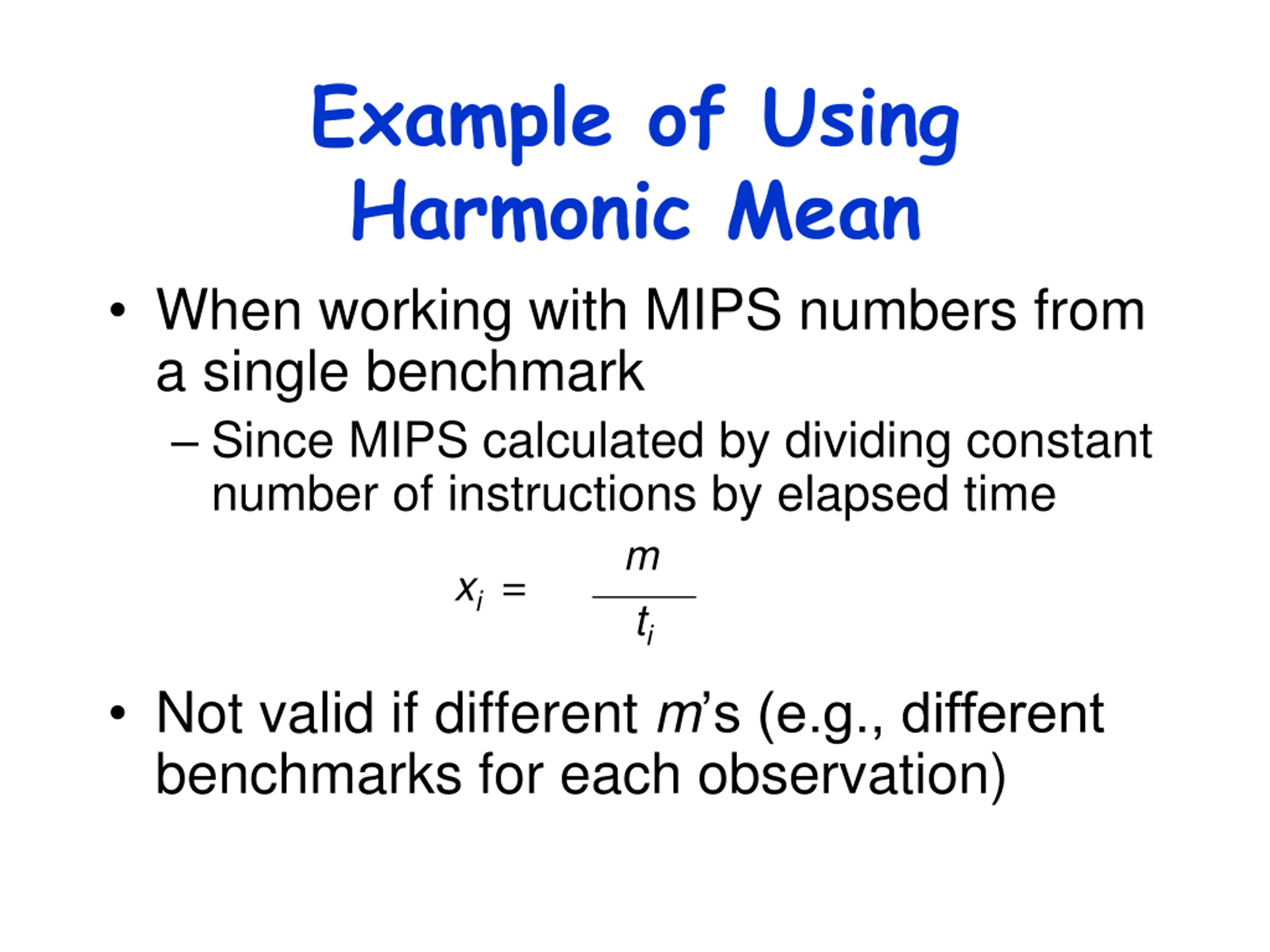 Example of Using Harmonic Mean When working with MIPS numbers from a single benchmark Since MIPS calculated by dividing constant number of instructions by elapsed time m ti xi = Not valid if different m s (e.g., different benchmarks for each observation)