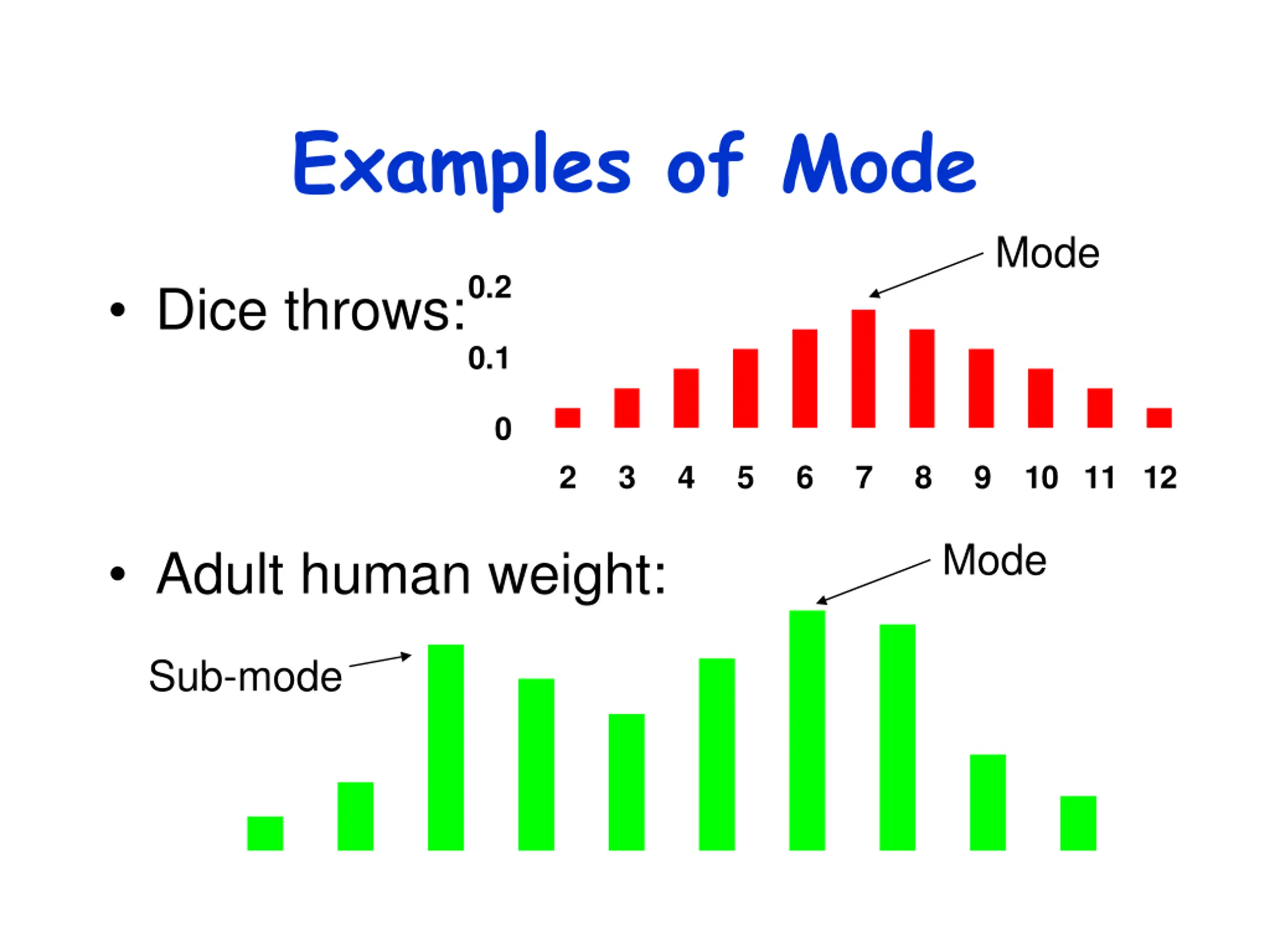 Examples of Mode Mode 0.2 Dice throws: 0.1 0 2 3 4 5 6 7 8 9 10 11 12 Mode Adult human weight: Sub-mode