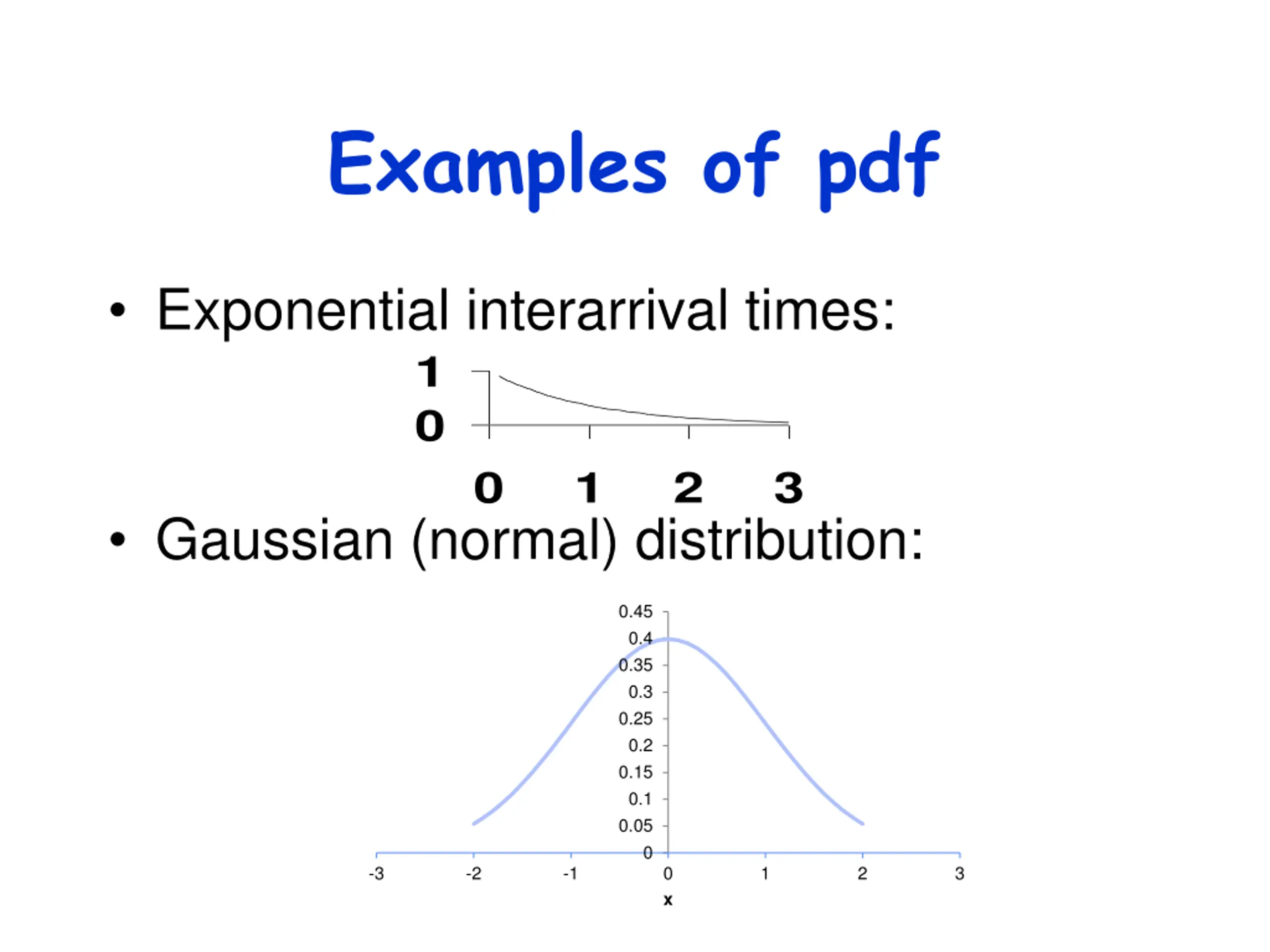 Examples of pdf Exponential interarrival times: 1 0 0 1 2 3 Gaussian (normal) distribution: 0.45 0.4 0.35 0.3 0.25 0.2 0.15 0.1 0.05 0 -3 -2 -1 0 x 1 2 3