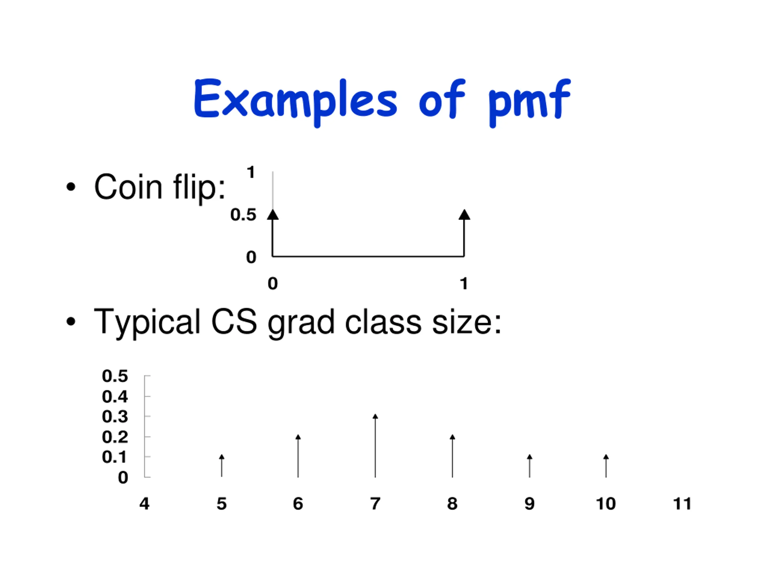 Examples of pmf 1 Coin flip: 0.5 0 0 1 Typical CS grad class size: 0.5 0.4 0.3 0.2 0.1 0 4 5 6 7 8 9 10 11