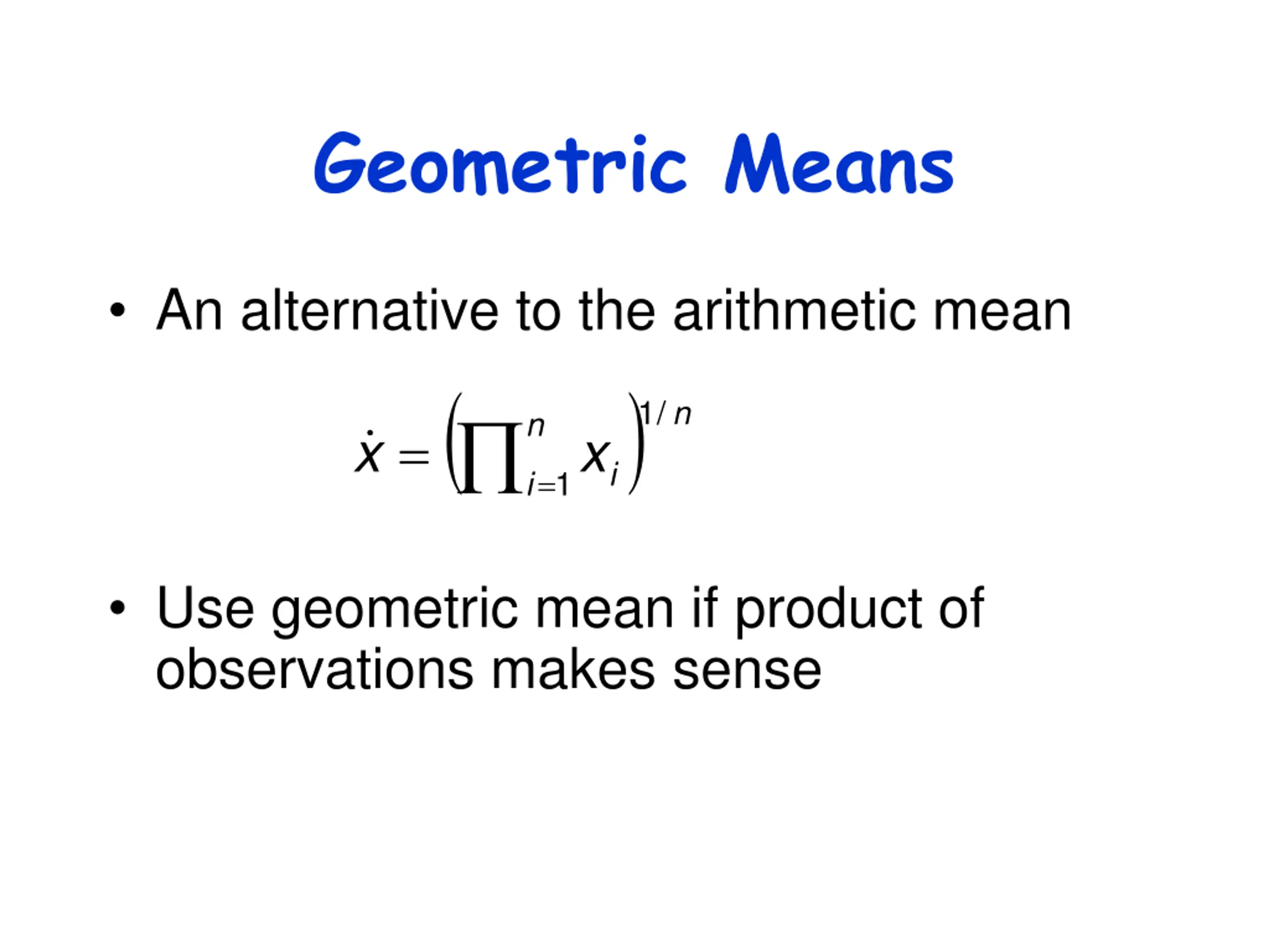 Geometric Means An alternative to the arithmetic mean ( i 1 = ) / 1 n n = x ix Use geometric mean if product of observations makes sense