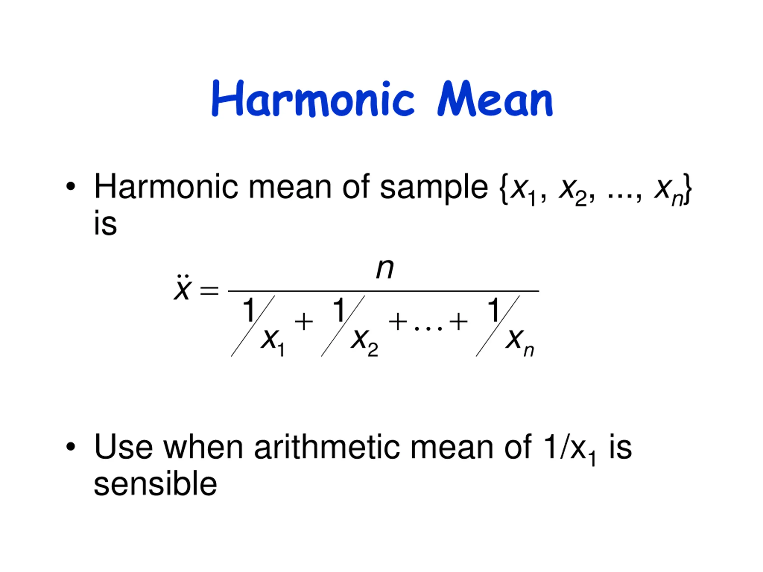 Harmonic Mean Harmonic mean of sample {x1, x2, ..., xn} is n x 1 1 2 1 = 1 + + + x x n x Use when arithmetic mean of 1/x1 is sensible