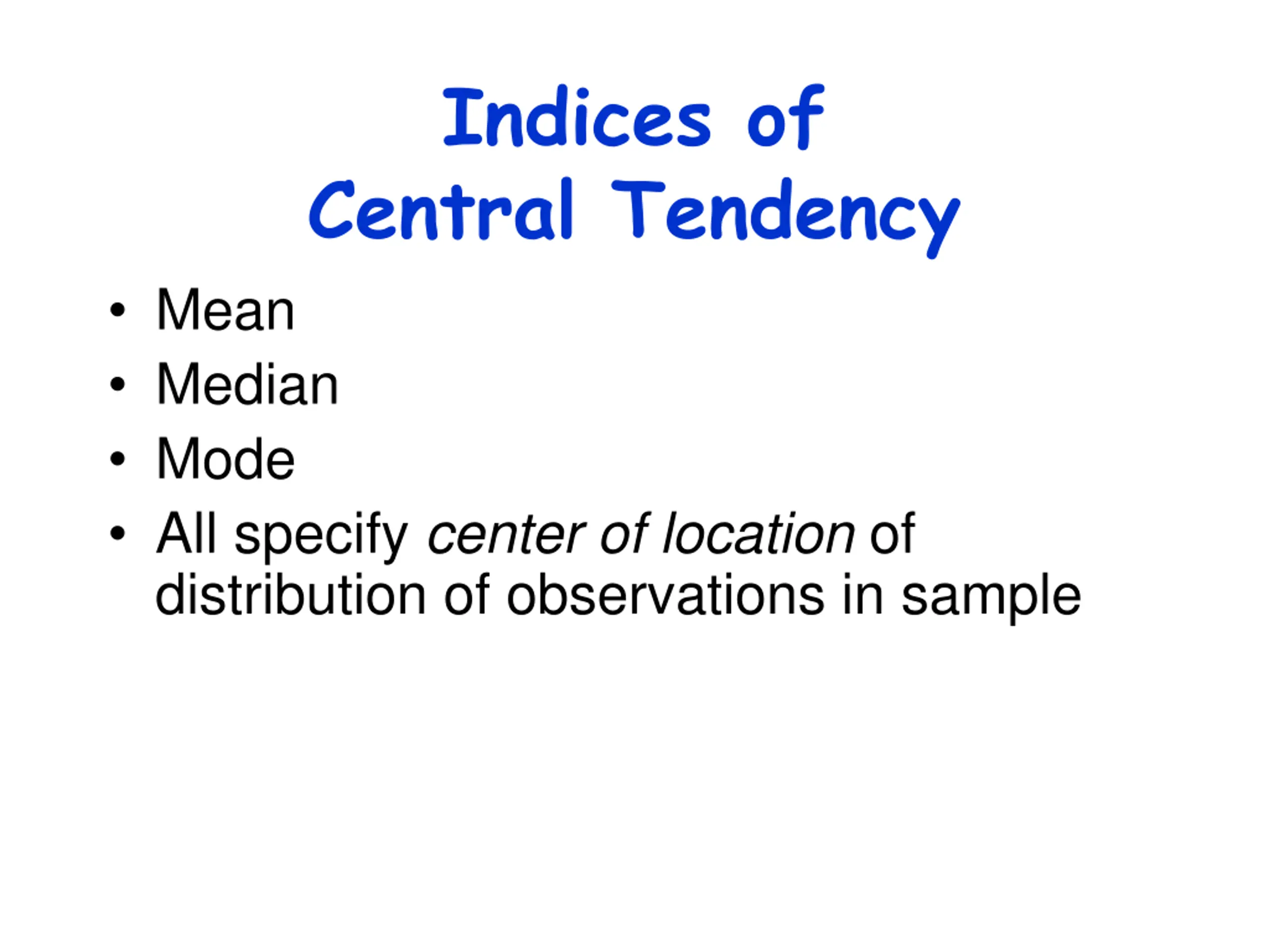 Indices of Central Tendency Mean Median Mode All specify center of location of distribution of observations in sample