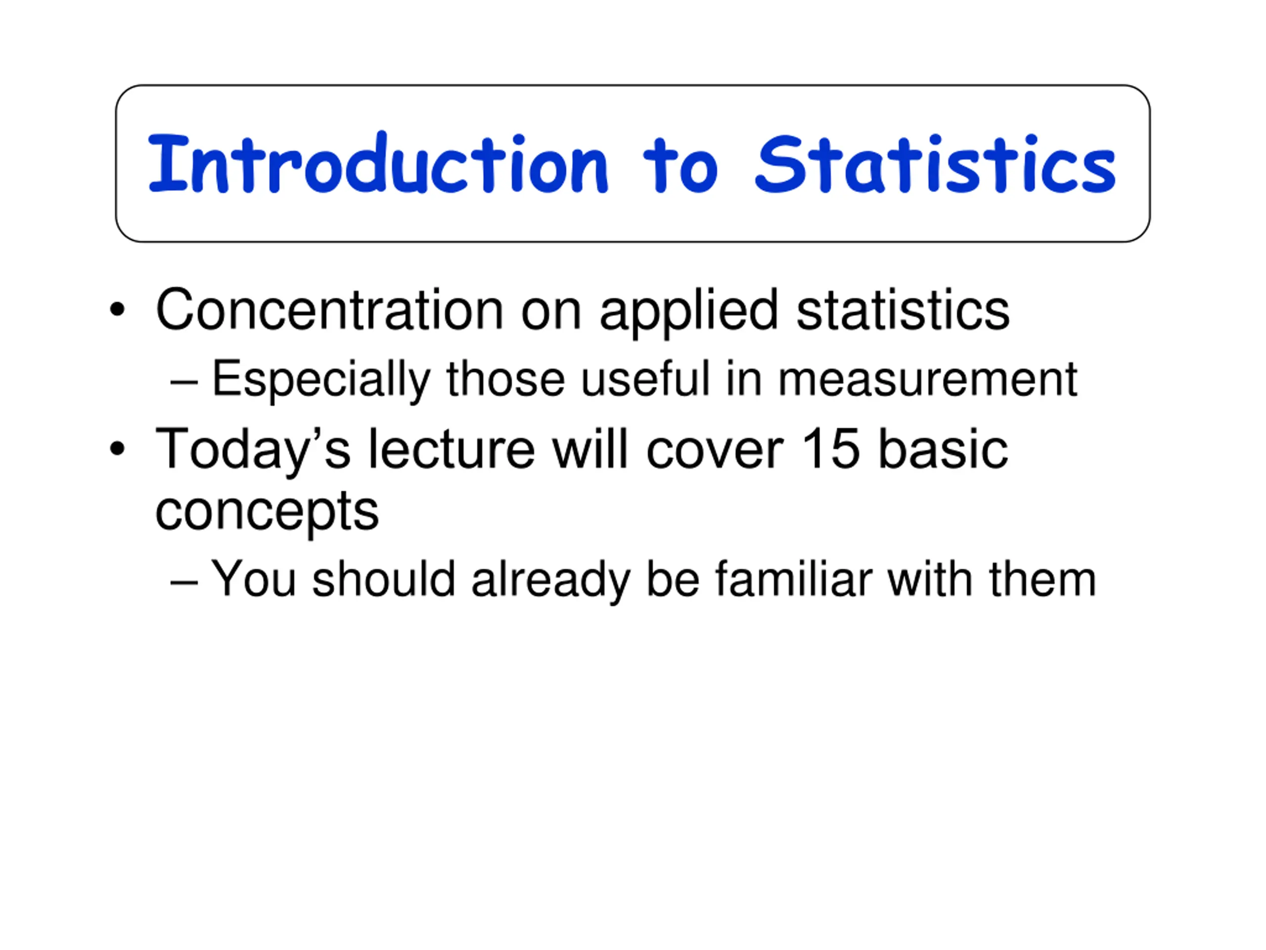 Introduction to Statistics Concentration on applied statistics Especially those useful in measurement Today s lecture will cover 15 basic concepts You should already be familiar with them