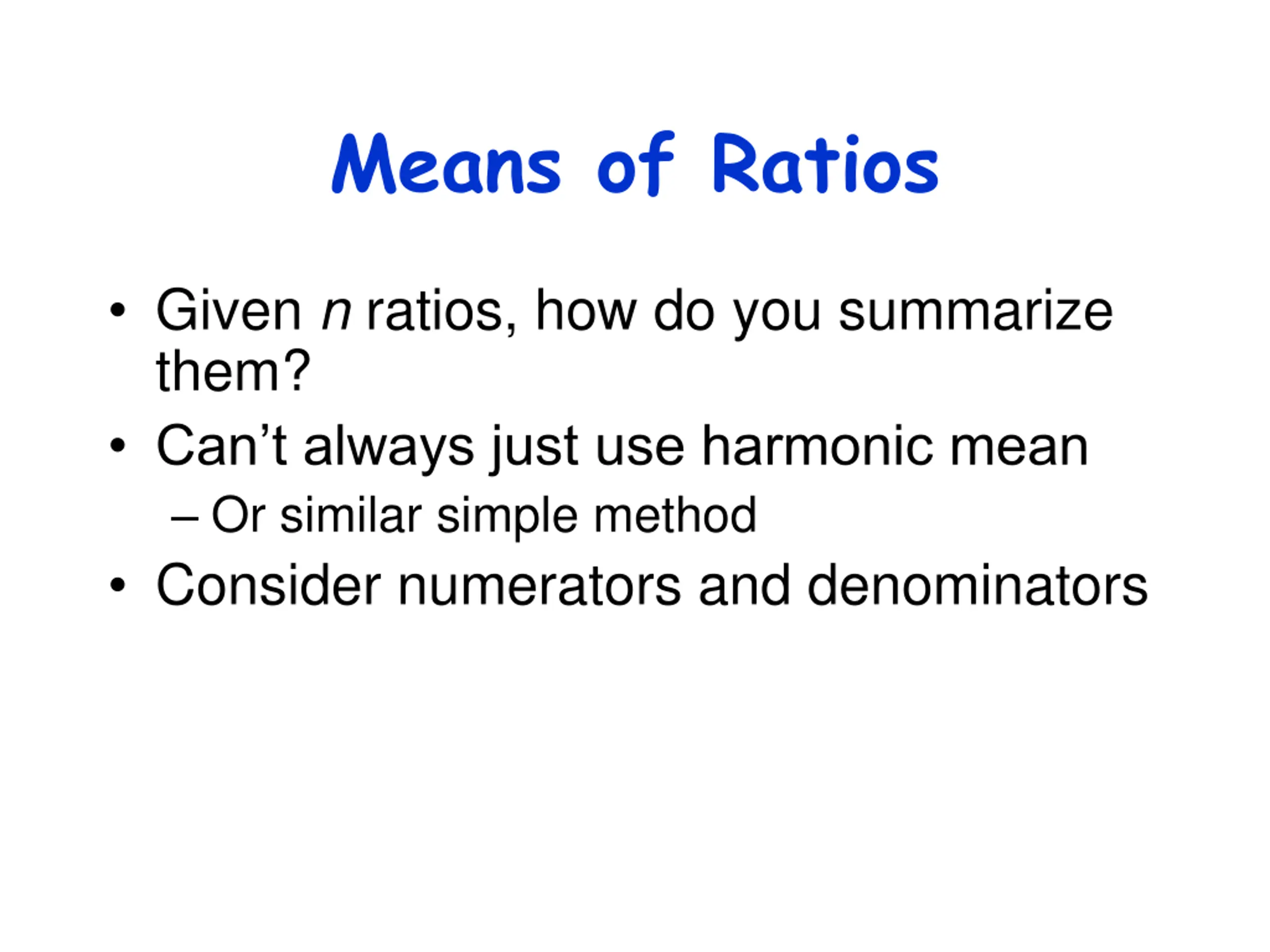 Means of Ratios Given n ratios, how do you summarize them? Can t always just use harmonic mean Or similar simple method Consider numerators and denominators
