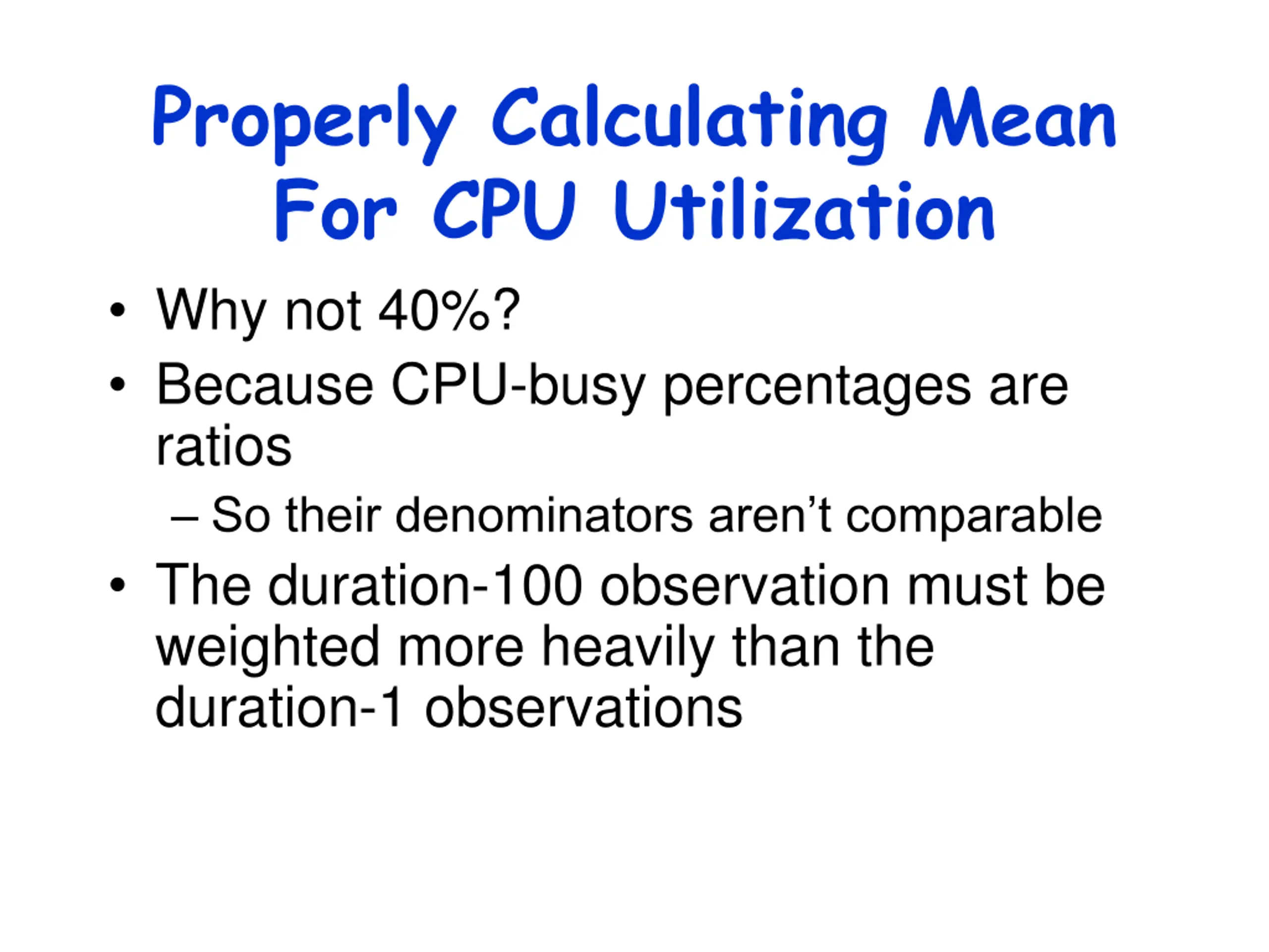 Properly Calculating Mean For CPU Utilization Why not 40%? Because CPU-busy percentages are ratios So their denominators aren t comparable The duration-100 observation must be weighted more heavily than the duration-1 observations