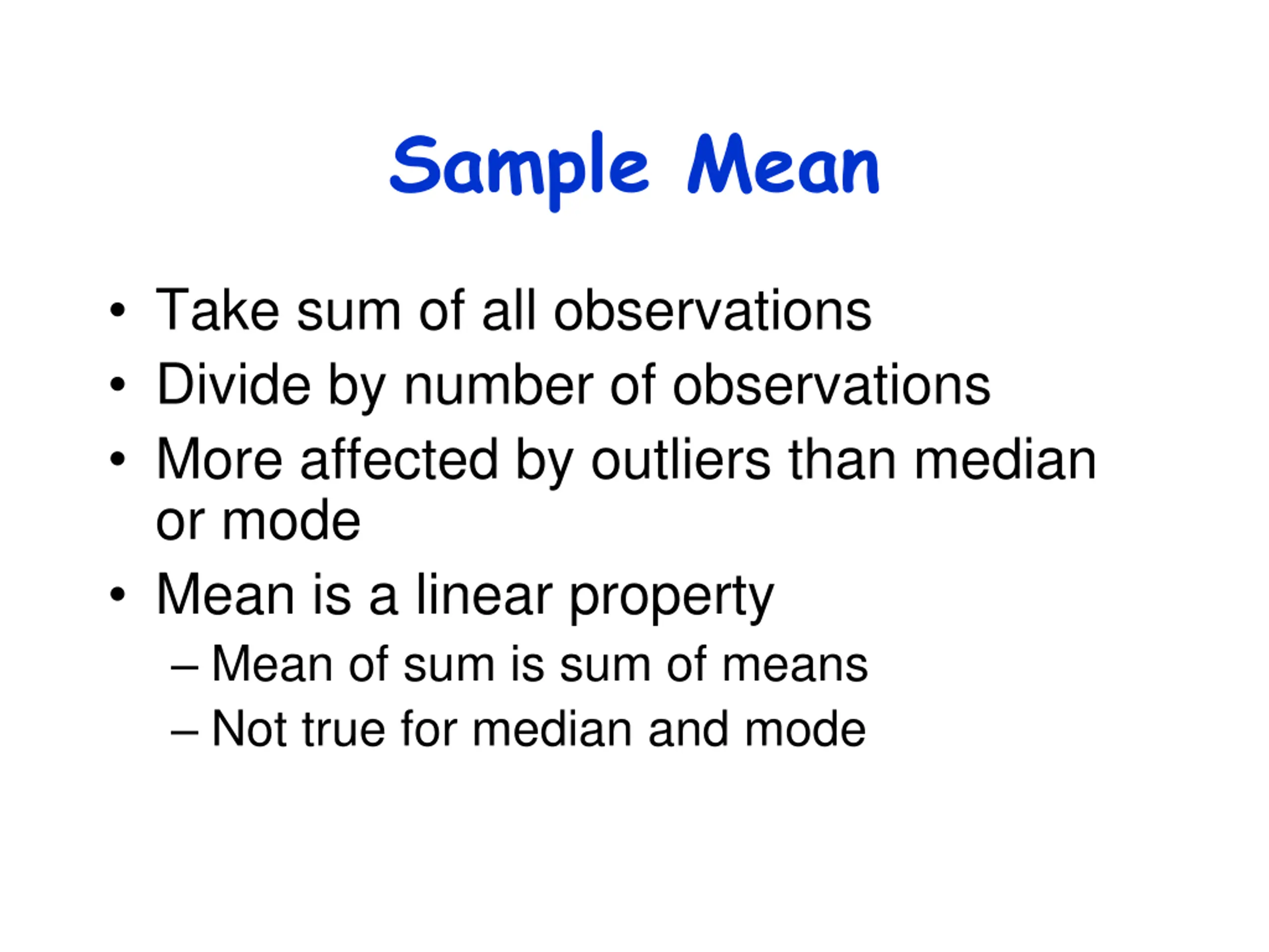 Sample Mean Take sum of all observations Divide by number of observations More affected by outliers than median or mode Mean is a linear property Mean of sum is sum of means Not true for median and mode