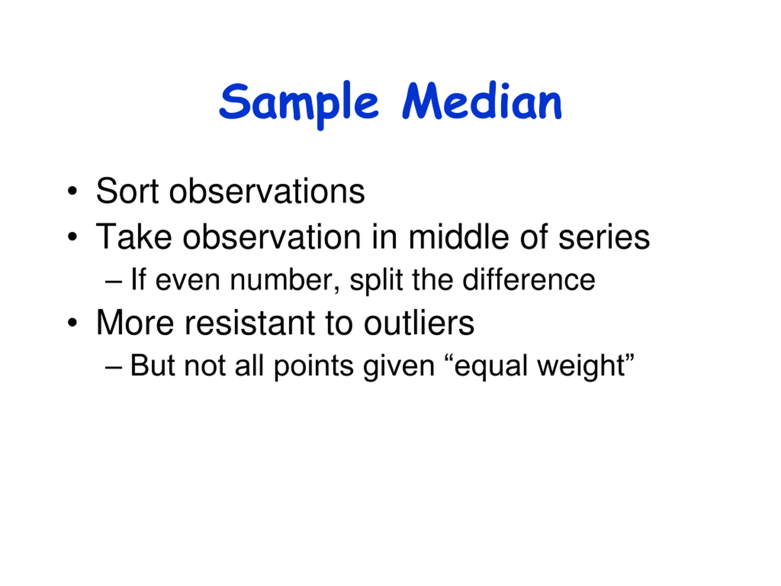 Sample Median Sort observations Take observation in middle of series If even number, split the difference More resistant to outliers But not all points given equal weight