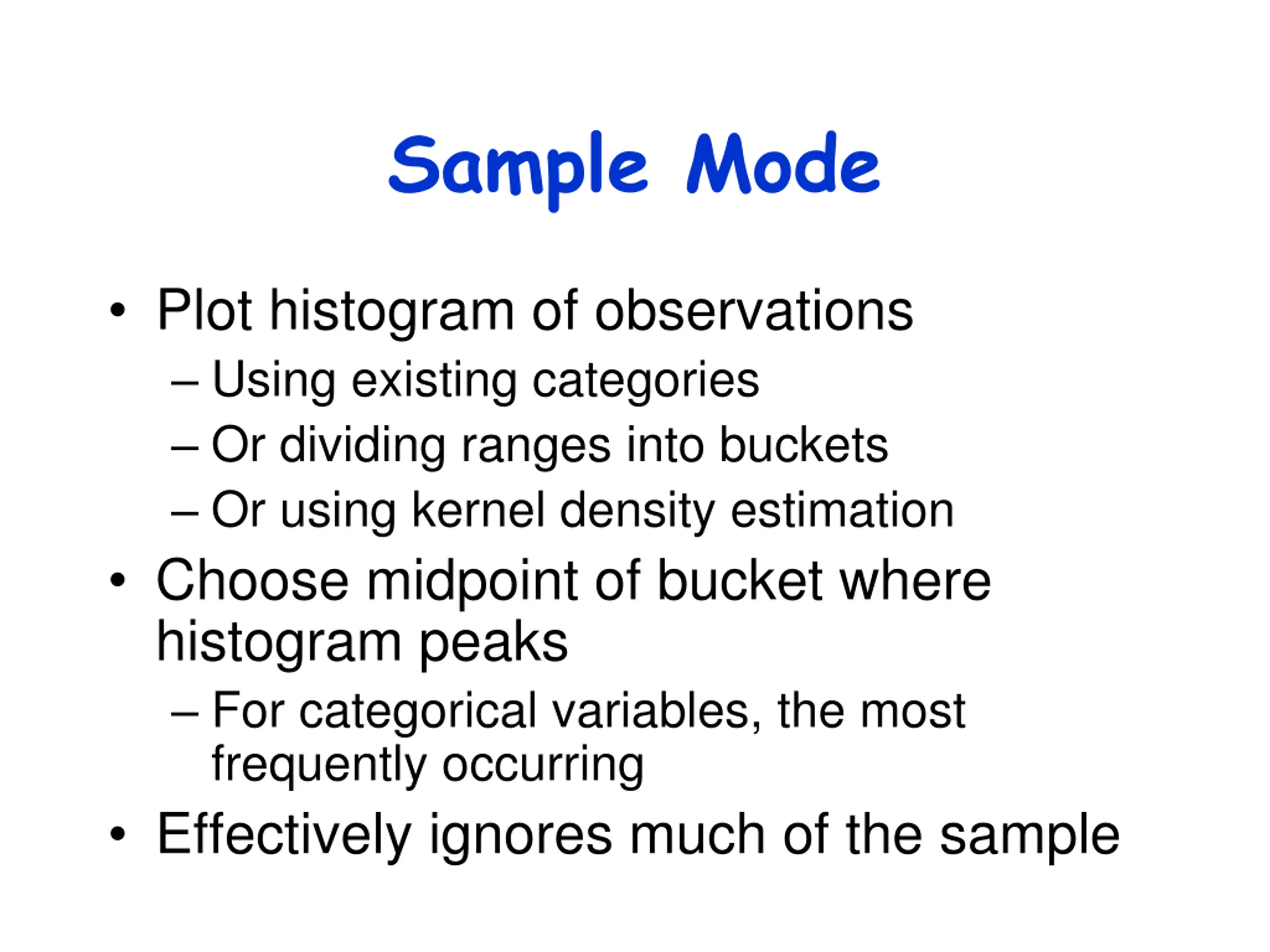 Sample Mode Plot histogram of observations Using existing categories Or dividing ranges into buckets Or using kernel density estimation Choose midpoint of bucket where histogram peaks For categorical variables, the most frequently occurring Effectively ignores much of the sample