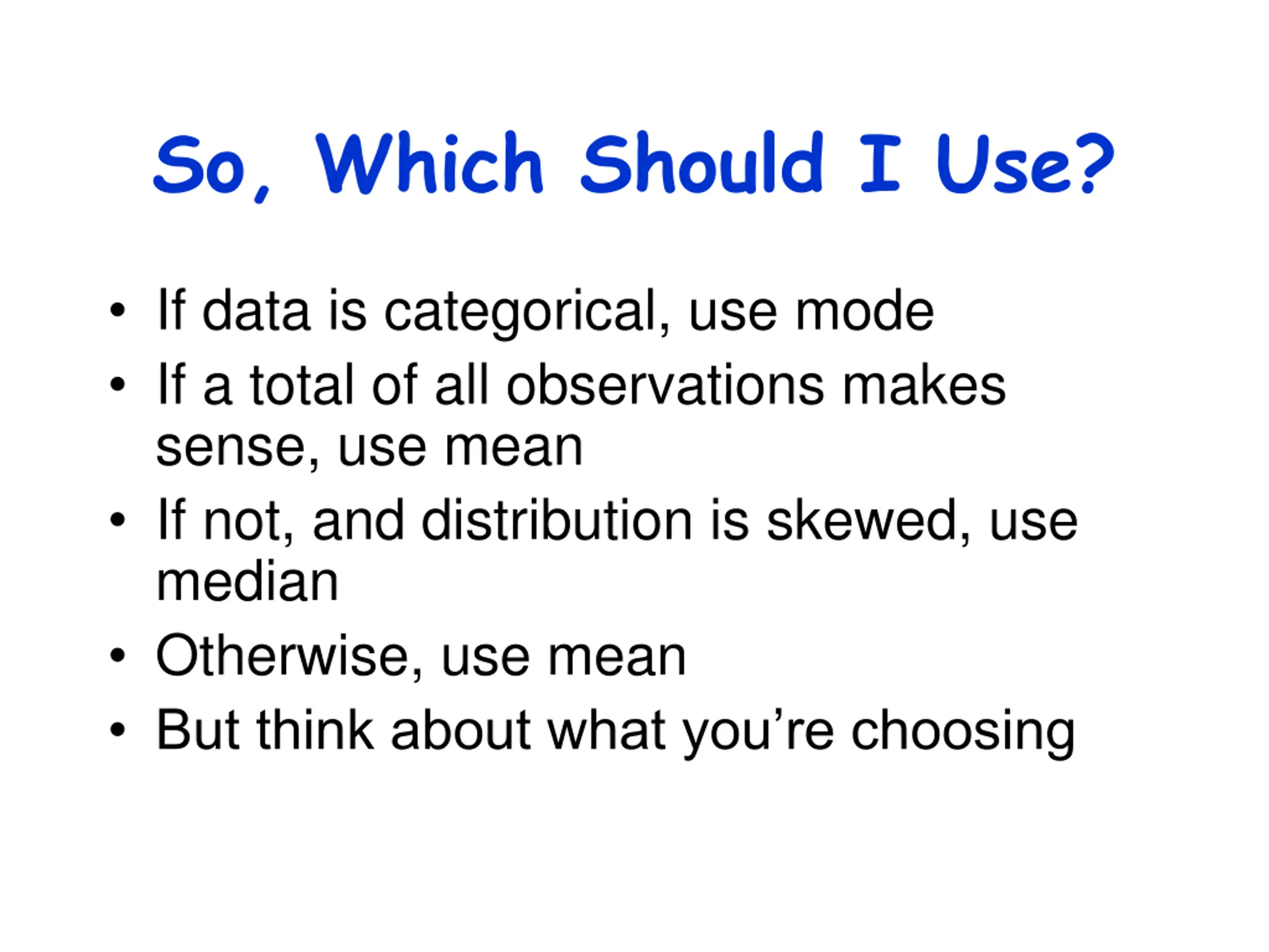 So, Which Should I Use? If data is categorical, use mode If a total of all observations makes sense, use mean If not, and distribution is skewed, use median Otherwise, use mean But think about what you re choosing