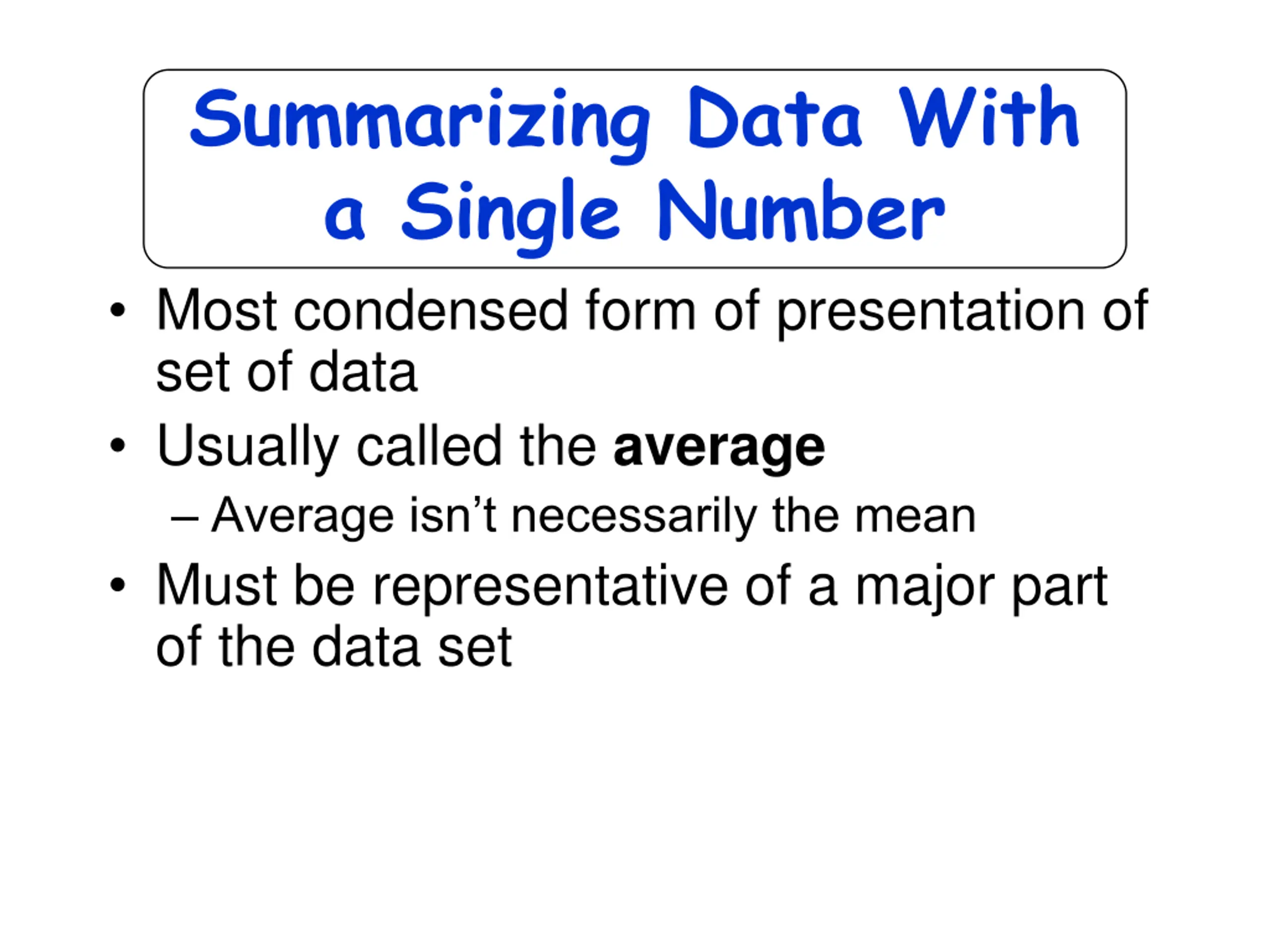 Summarizing Data With a Single Number Most condensed form of presentation of set of data Usually called the average Average isn t necessarily the mean Must be representative of a major part of the data set