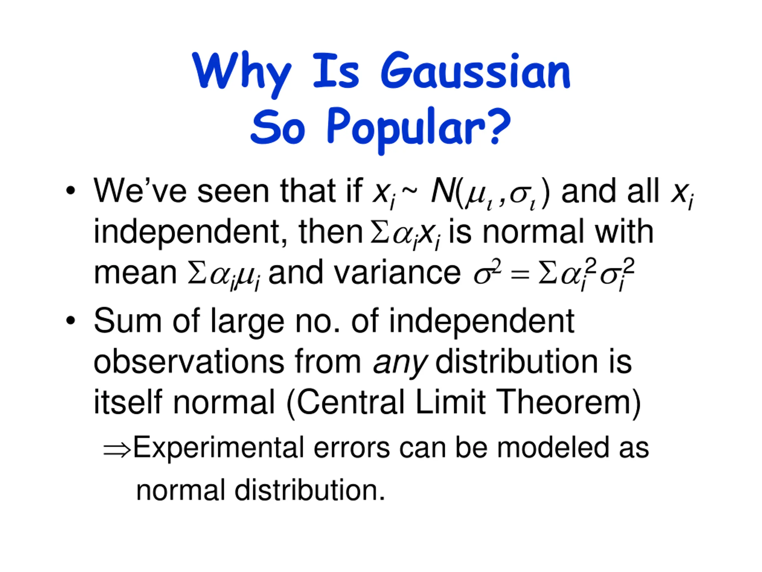 Why Is Gaussian So Popular? We ve seen that if xi ~ N( , ) and all xi independent, then ixi is normal with mean i i and variance = i2 i2 Sum of large no. of independent observations from any distribution is itself normal (Central Limit Theorem) Experimental errors can be modeled as normal distribution.