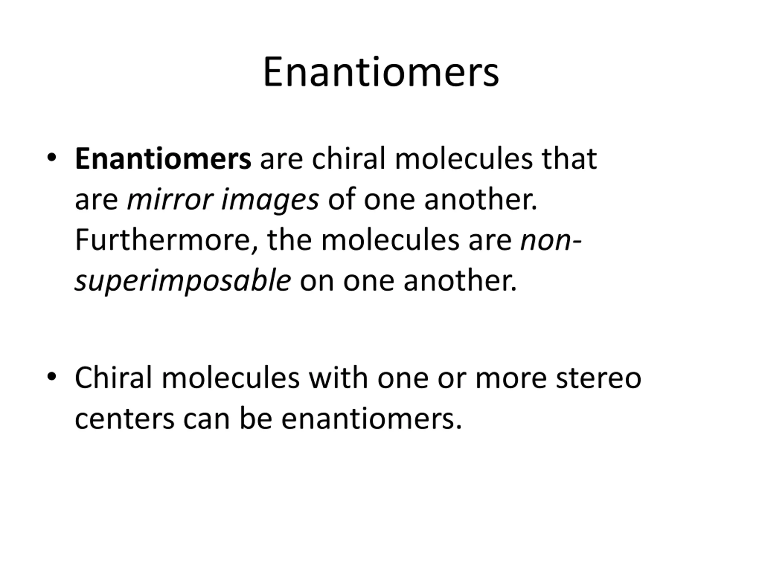 Enantiomers Enantiomers are chiral molecules that are mirror images of one another. Furthermore, the molecules are non- superimposable on one another. Chiral molecules with one or more stereo centers can be enantiomers.