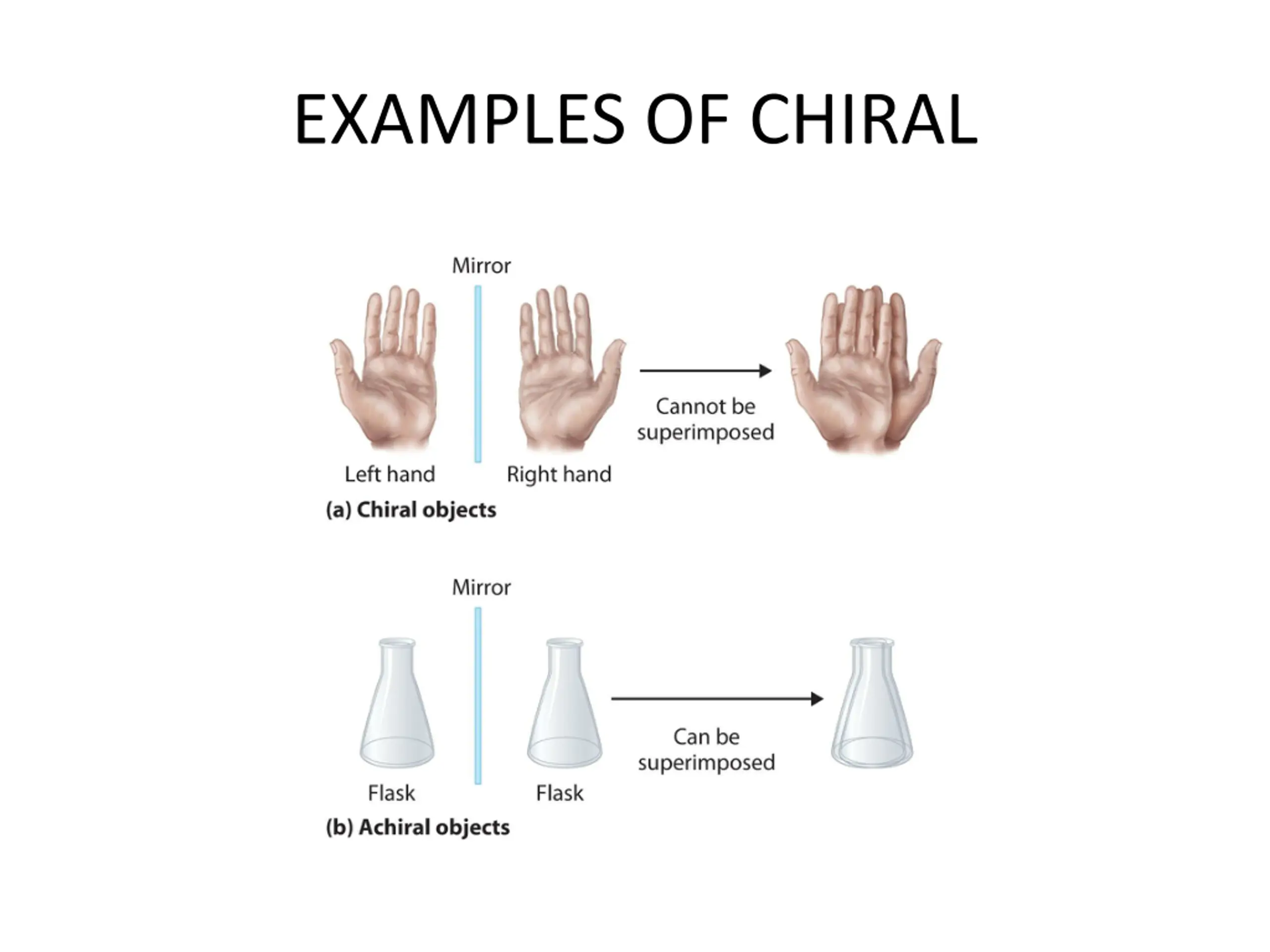 Chirality The existence of these molecules are determined by concept known as chirality. The word "chiral" was derived from the Greek word for hand, because our hands display a good example of chirality since they are non- superimposable mirror images of each other.