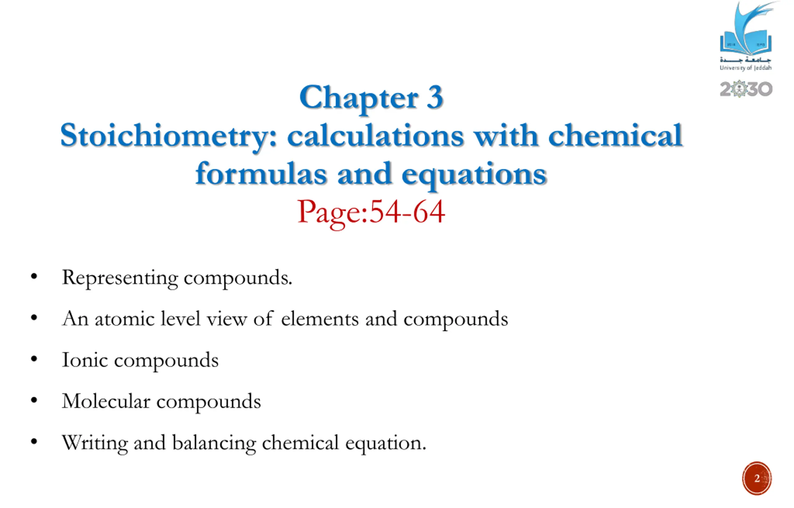 Chapter 3 Stoichiometry: calculations with chemical formulas and equations Page:54-64 Representing compounds. An atomic level view of elements and compounds Ionic compounds Molecular compounds Writing and balancing chemical equation. 2
