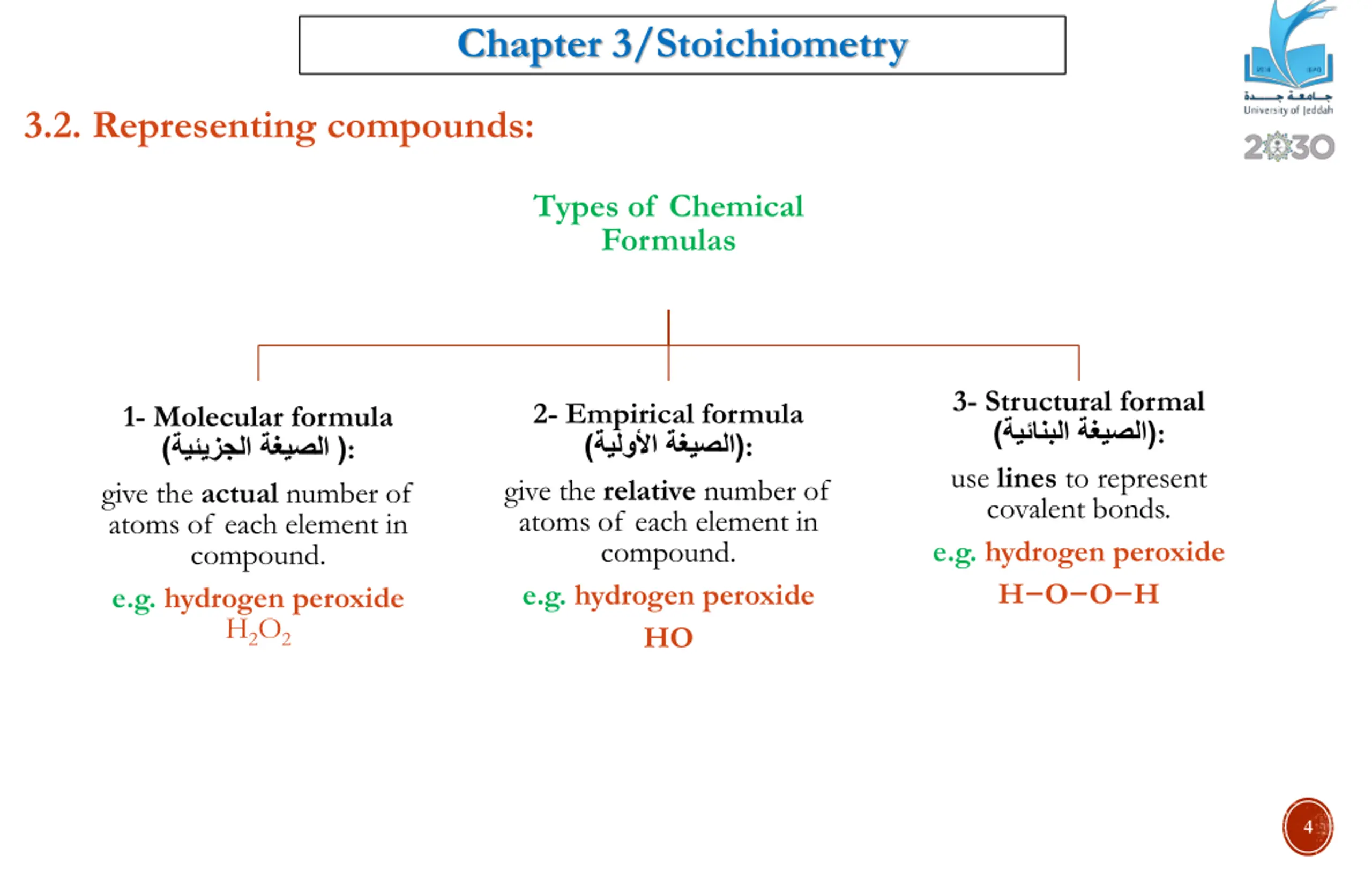 Chapter 3/Stoichiometry 3.2. Representing compounds: Types of Chemical Formulas 3- Structural formal ) use lines to represent covalent bonds. e.g. hydrogen peroxide H O O H 2- Empirical formula ) give the relative number of atoms of each element in compound. e.g. hydrogen peroxide HO 1- Molecular formula ) give the actual number of atoms of each element in compound. e.g. hydrogen peroxide H2O2 ( : ( : (: 4