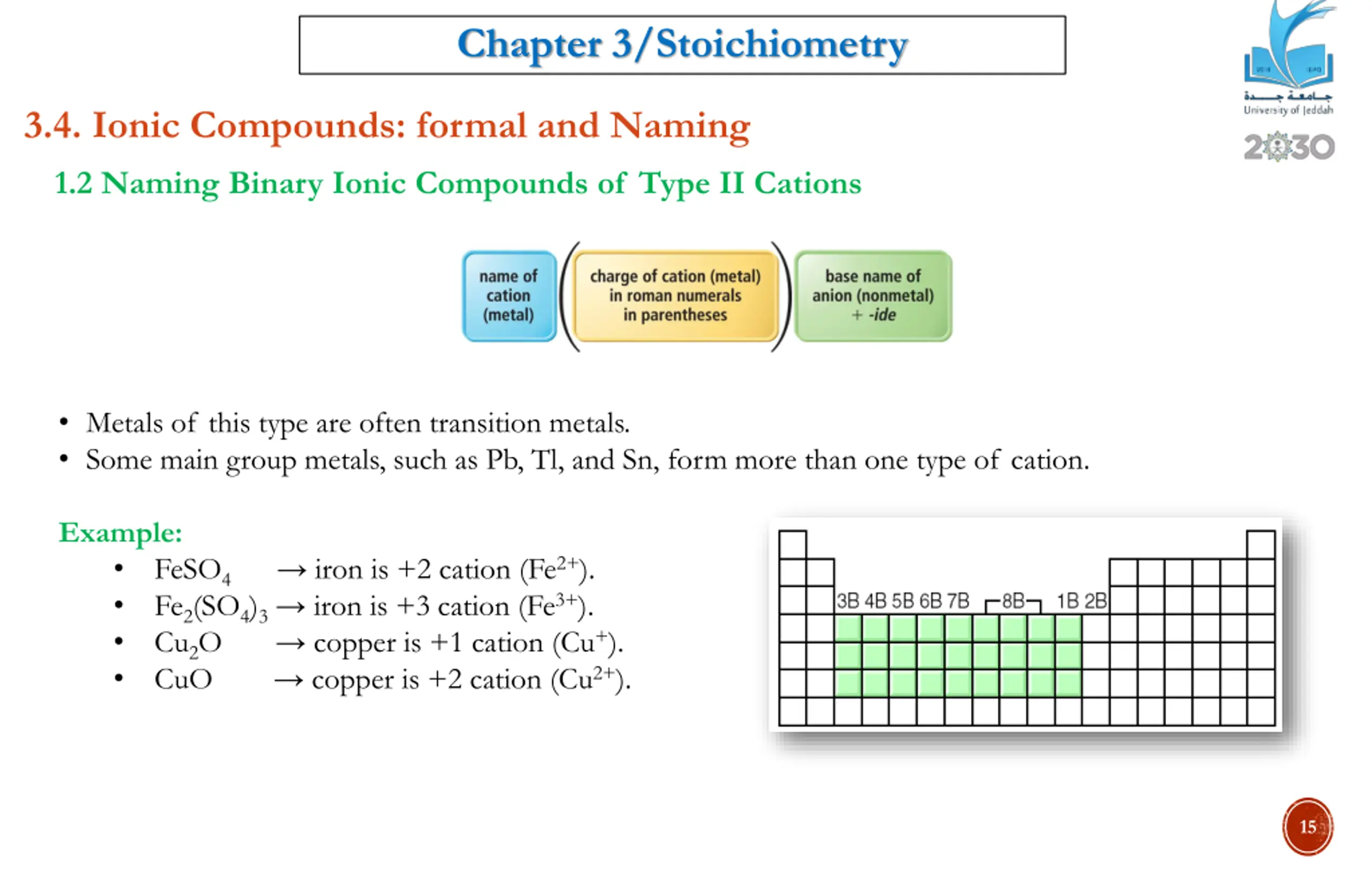 Chapter 3/Stoichiometry 3.4. Ionic Compounds: formal and Naming 1.2 Naming Binary Ionic Compounds of Type II Cations Metals of this type are often transition metals. Some main group metals, such as Pb, Tl, and Sn, form more than one type of cation. Example: FeSO4 iron is +2 cation (Fe2+). Fe2(SO4)3 iron is +3 cation (Fe3+). Cu2O copper is +1 cation (Cu+). CuO copper is +2 cation (Cu2+). 15
