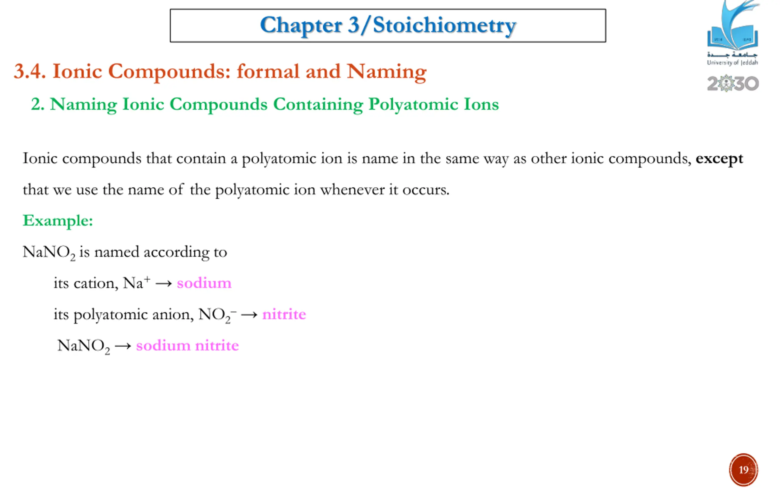 Chapter 3/Stoichiometry 3.4. Ionic Compounds: formal and Naming 2. Naming Ionic Compounds Containing Polyatomic Ions Ionic compounds that contain a polyatomic ion is name in the same way as other ionic compounds, except that we use the name of the polyatomic ion whenever it occurs. Example: NaNO2 is named according to its cation, Na+ sodium its polyatomic anion, NO2 nitrite NaNO2 sodium nitrite 19
